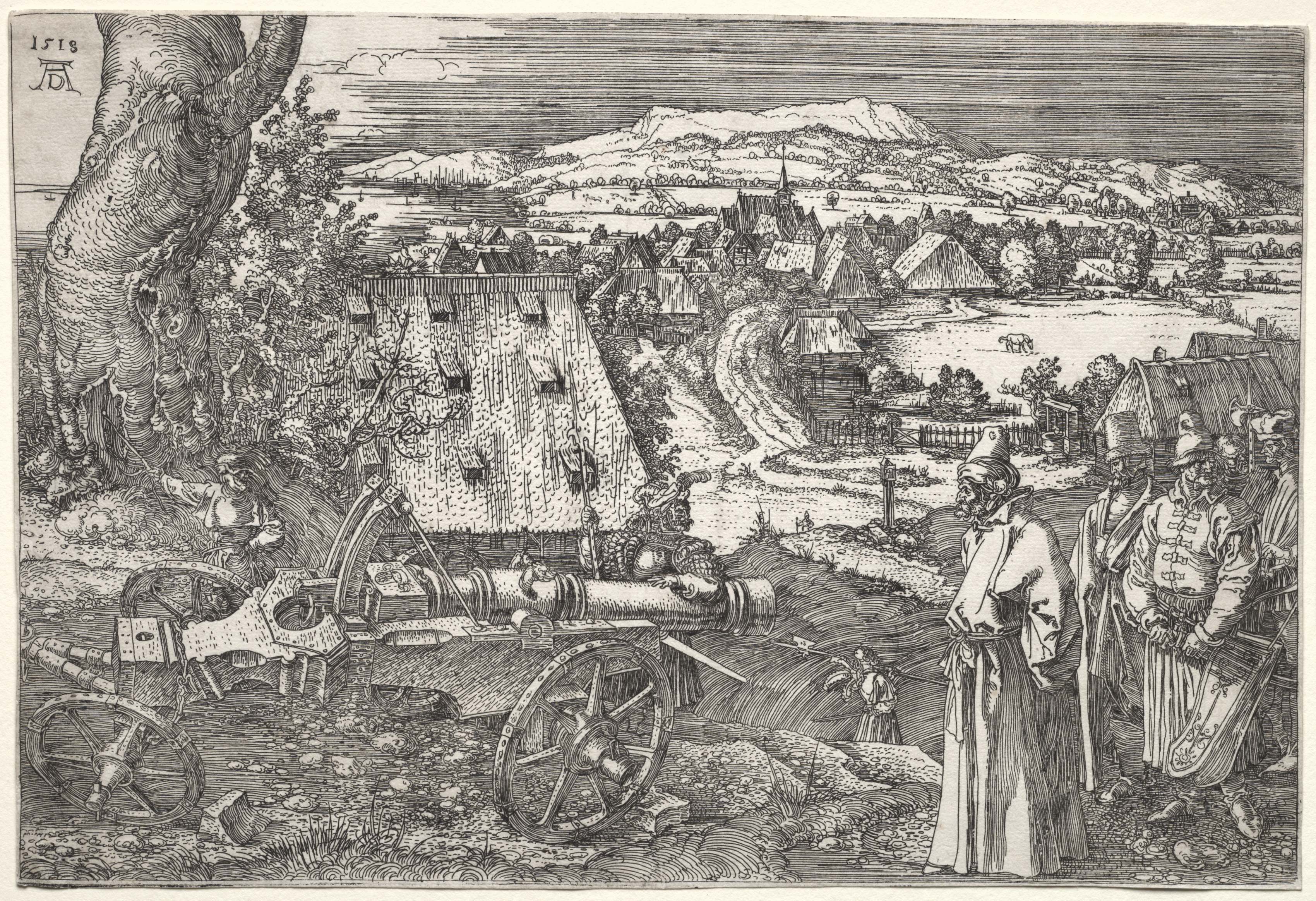 Black and white landscape with a large cannon in the foreground that has two large wheels. There are several people on the right side. The background shows a town and mountains. The scene depicts Albrecht Dürer's 'Landscape with the Cannon'.