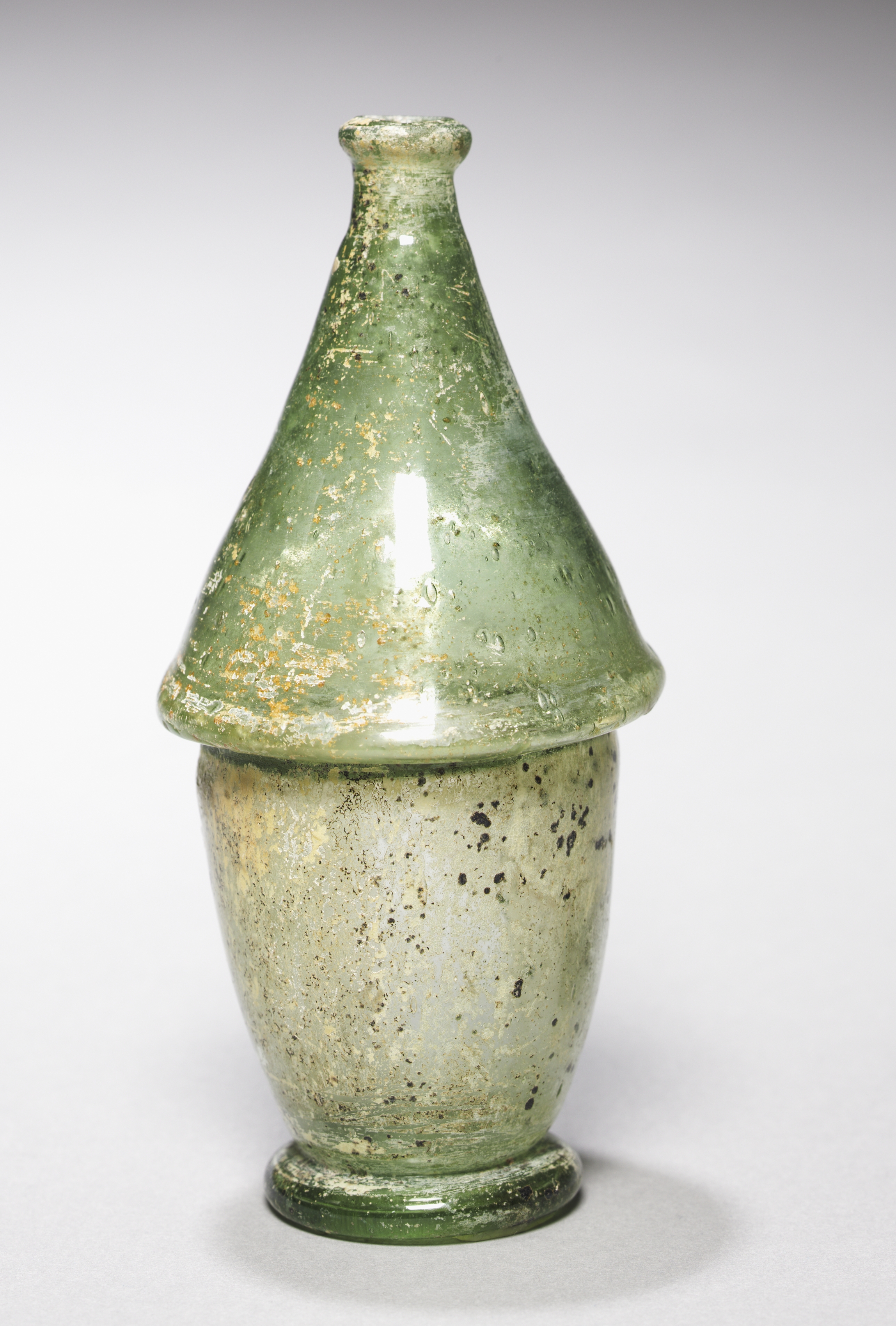 Double-Conical Bottle by Bernard Leach. The object is a ceramic vessel with two main parts: a lower rounded body and an upper conical top. The lower body is off-white with black speckles. The base of the lower body is circular and flat. The upper body is conical, narrowing to a short neck with a small opening at the top. The upper body is green with gold flecks. The background is white with a gray gradient at the top. The object casts a shadow.