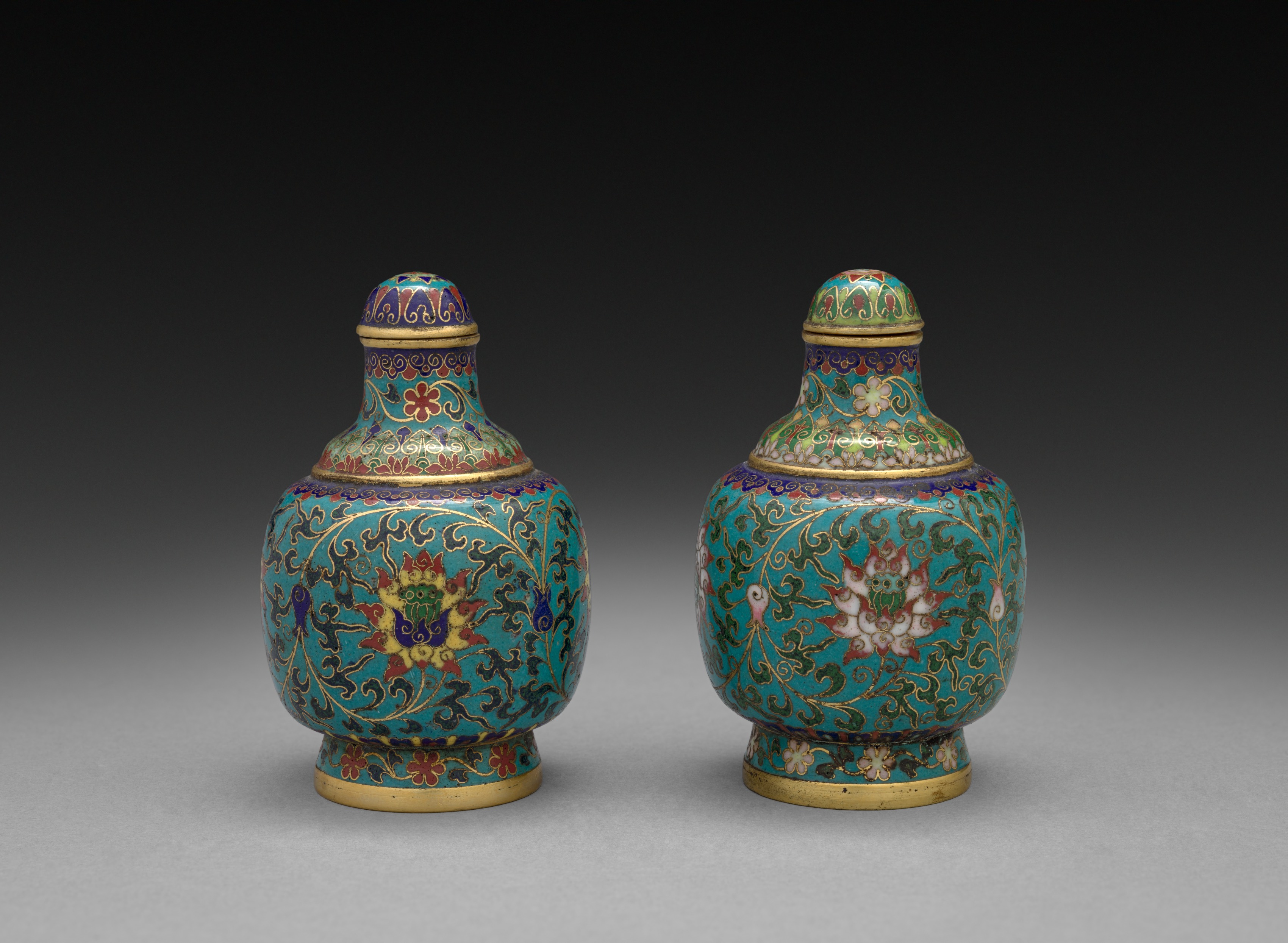 Pair of Snuff Bottles with Floral Scrolls by artist. Two teal-colored snuff bottles with domed lids. The bodies of the bottles are bulbous and rounded. Each bottle features a floral pattern with gold, red, white, and black designs. The lids and bases of the bottles are gold-colored. The floral patterns on both bottles are similar but not identical. The background of the image transitions from dark gray at the top to light gray at the bottom. The snuff bottles are positioned side by side.