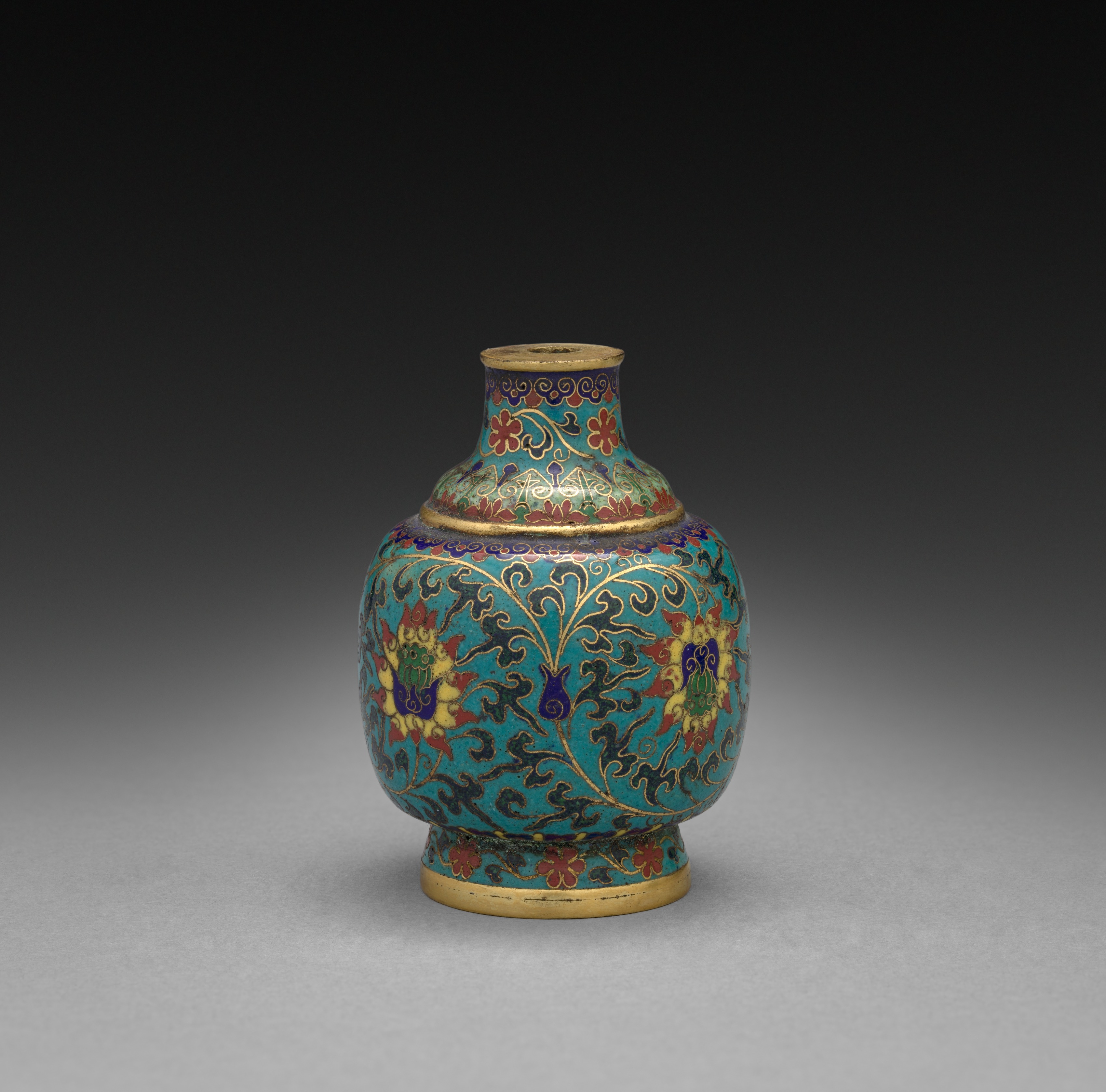 Small, rounded vase with a short neck and wide body. The vase has a turquoise base color with gold, red, purple, and yellow floral designs. The floral patterns include scrolling vines and stylized flowers. The base and top of the vase are gold-colored. The top of the vase has a small, circular opening. The background of the image is a gradient from black at the top to gray at the bottom. The vase appears to be made of a material such as metal or ceramic. The overall style of the vase suggests it may be a snuff bottle. The artist's work is titled "Snuff Bottle with Floral Scrolls".
