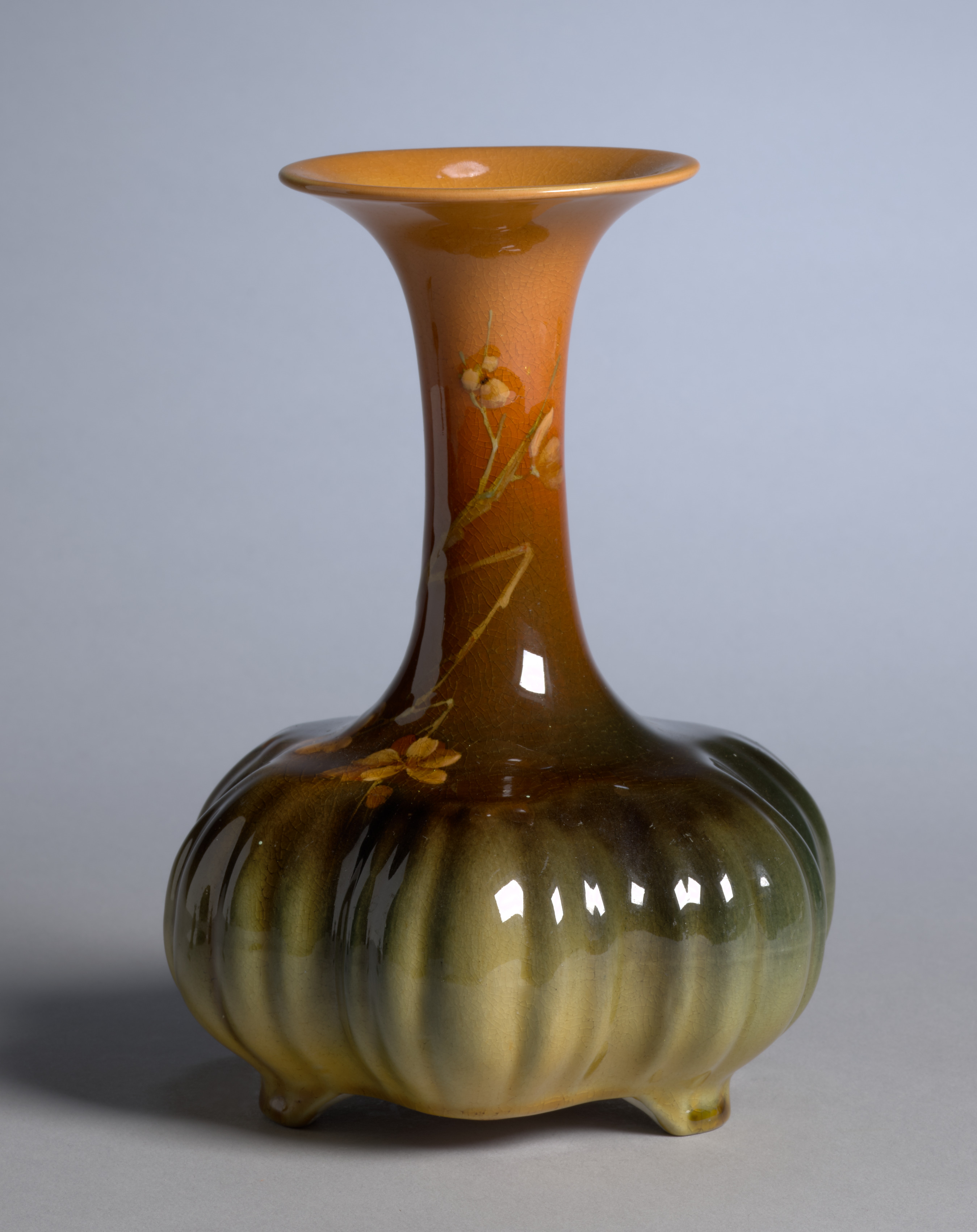 Vase by Rookwood Pottery Company. The vase has a wide mouth and a long neck that tapers outwards. The top portion of the vase is orange with a floral design. The base of the vase is bulbous with vertical ridges and a green glaze that darkens towards the bottom. The vase has three small feet at the bottom. The background is a plain gray color.