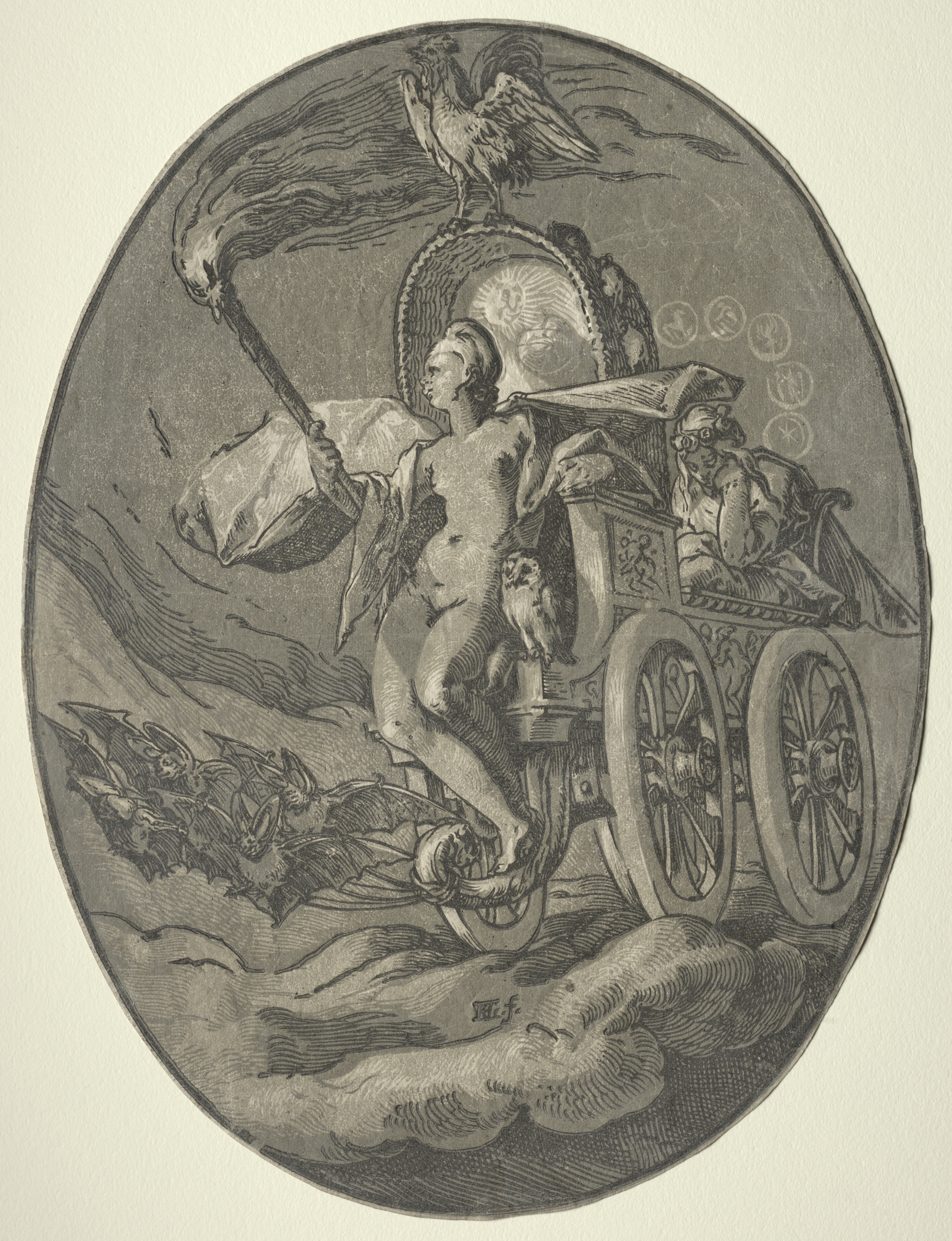 Oval-shaped image in shades of gray. A nude man with long hair and a cloth flowing behind him stands on the left side of a chariot. He holds a torch-like object with a flame at the top in his right hand. The chariot has large wheels with spokes and a decorative body. A bearded man sits in the chariot holding a book and a horn-like object. A bird, possibly an owl or eagle, sits on top of the chariot. Several bats are flying around the lower left side. The background features cloudy, wavy lines.