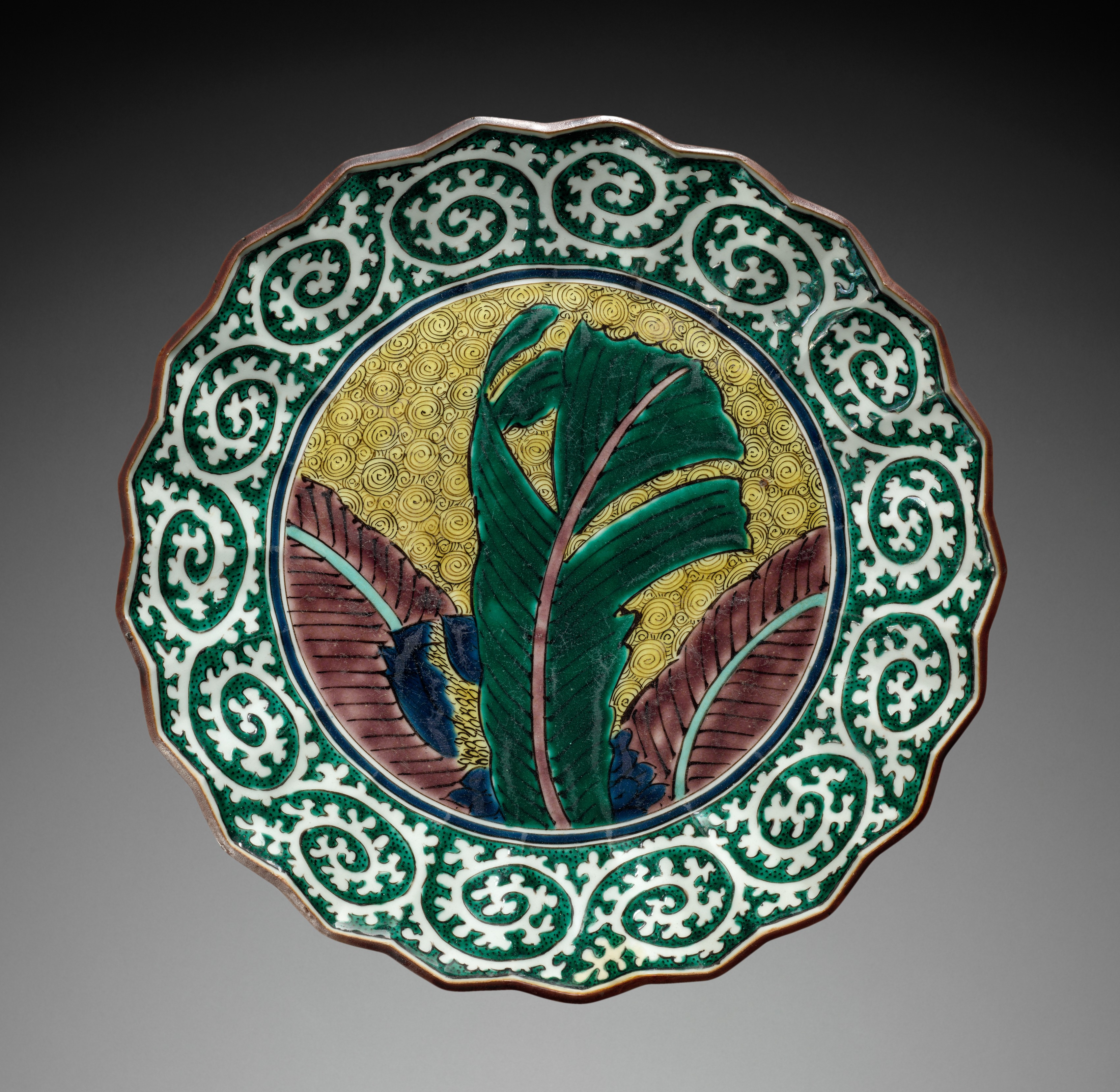 The Foliate Dish with Banana Leaf features a plate with a rounded, scalloped edge and a predominantly green and white color scheme. The plate's border displays a swirling green and white pattern. The center of the plate showcases a banana leaf design against a gold background with a swirling pattern. The banana leaf is predominantly green with a pink midrib and is surrounded by two brown leaves with blue and green edges. The plate appears to have a brown base color visible along the edge. The background of the image transitions from black at the top to gray at the bottom.