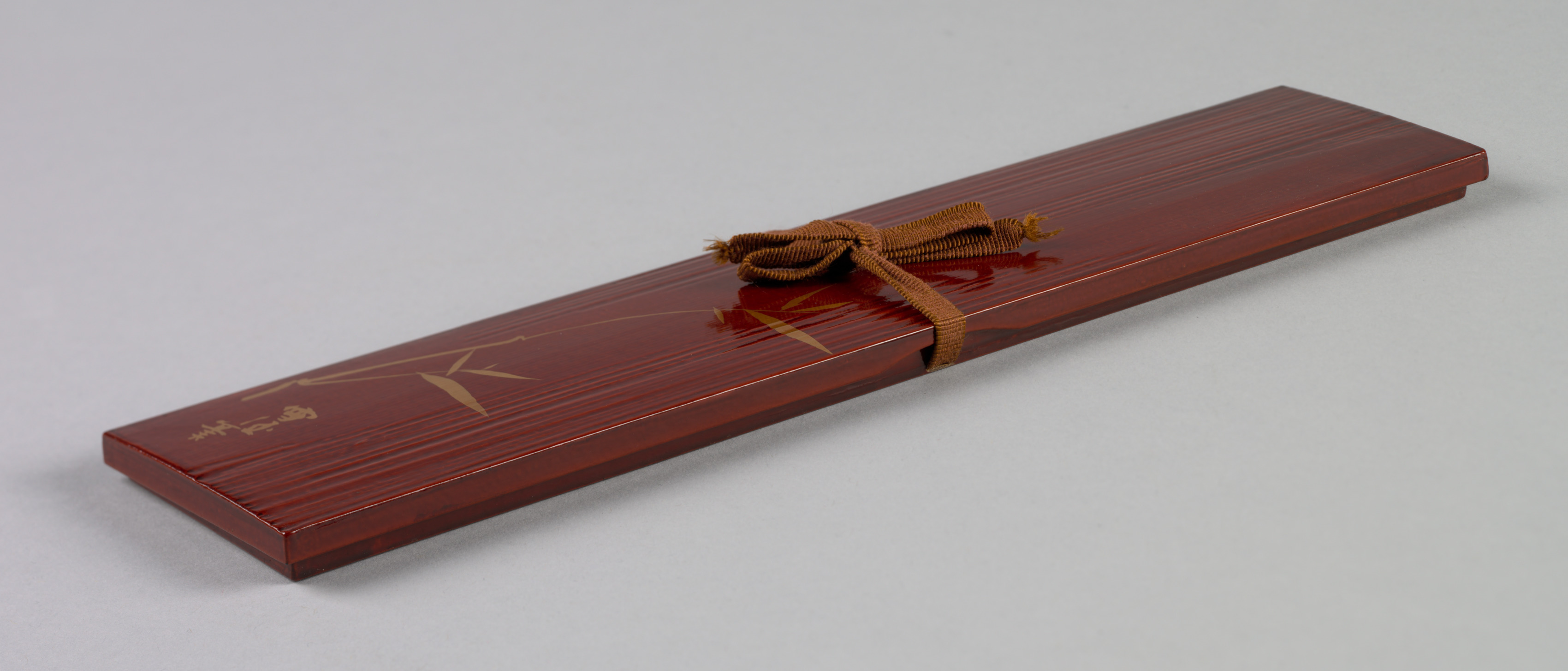 Rectangular box made of dark red wood with a lid; box has a shiny finish; a brown cord wrapped around the center; top surface has gold designs; several horizontal grooves; background is light gray.