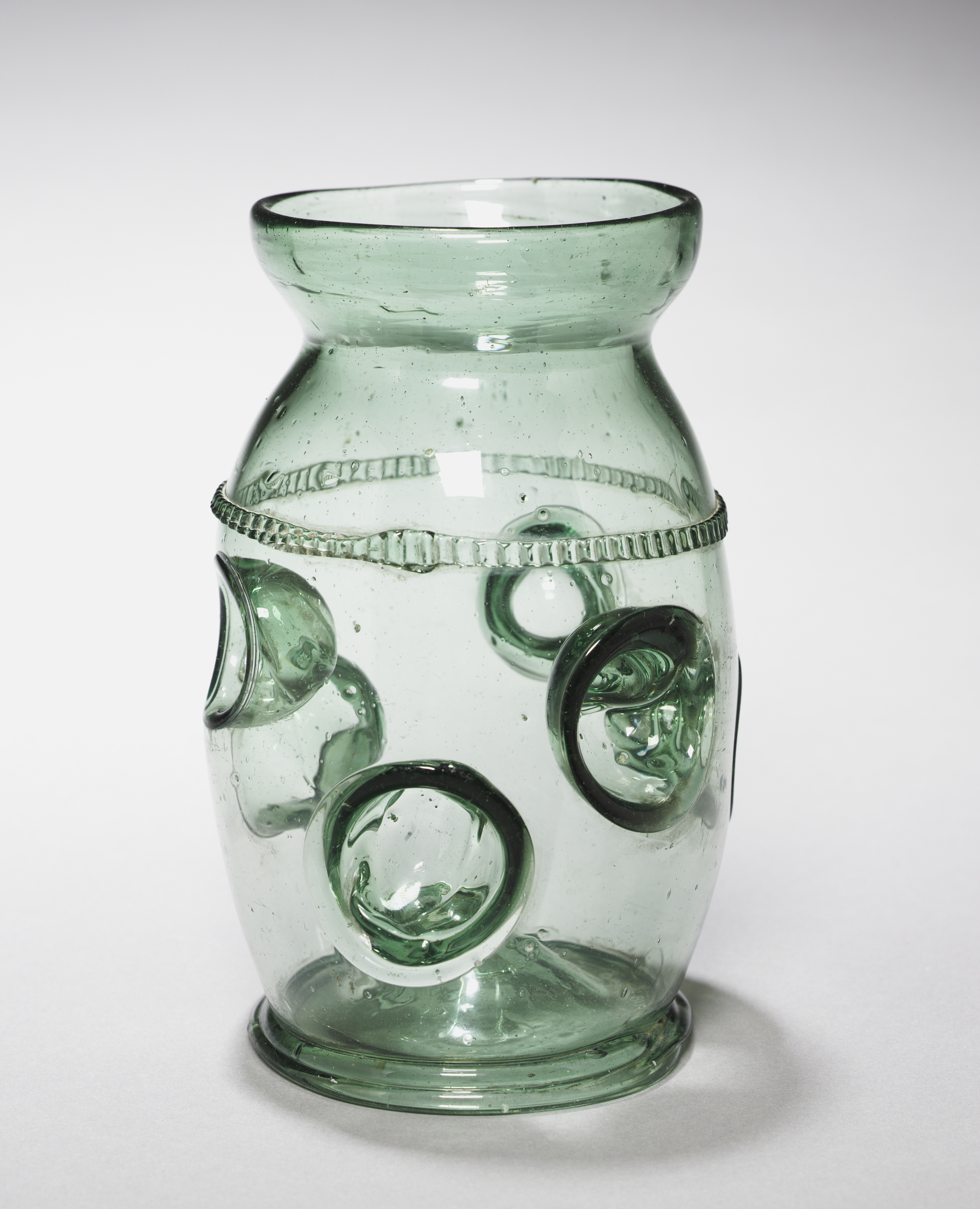 Pale green glass vase, Tumbler (Daumenglas), with wide mouth and short neck; cylindrical body with applied bands around shoulder; lower body decorated with five applied, unattached, hollow, green glass rings of various sizes.