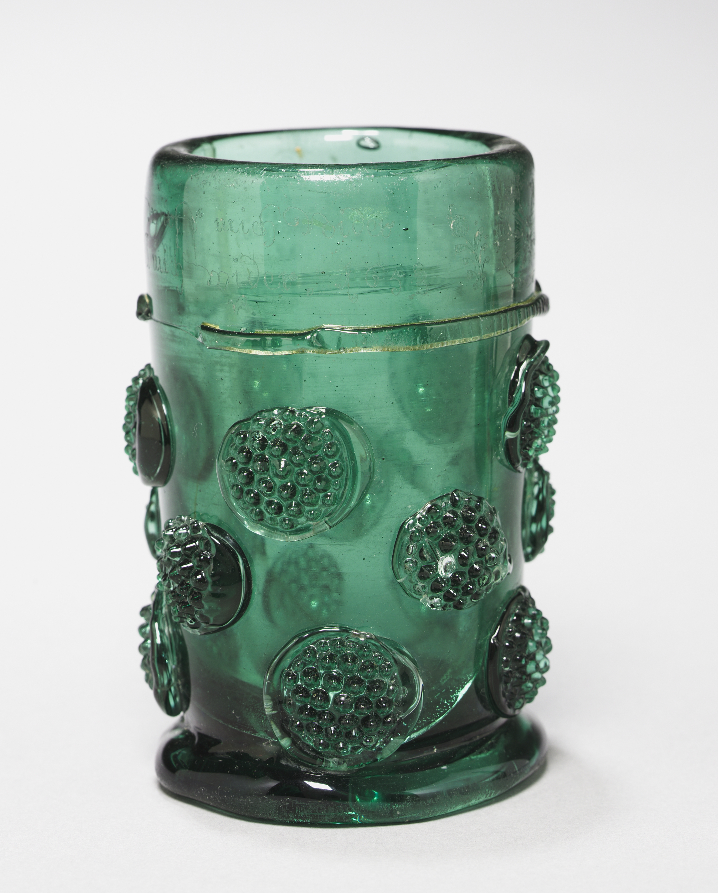 Green glass beaker with a cylindrical body and circular base. The beaker has a wide mouth and a narrow band around the middle. It features 13 circular protrusions of varying sizes with bumpy surfaces, arranged randomly around the body. The background is white.