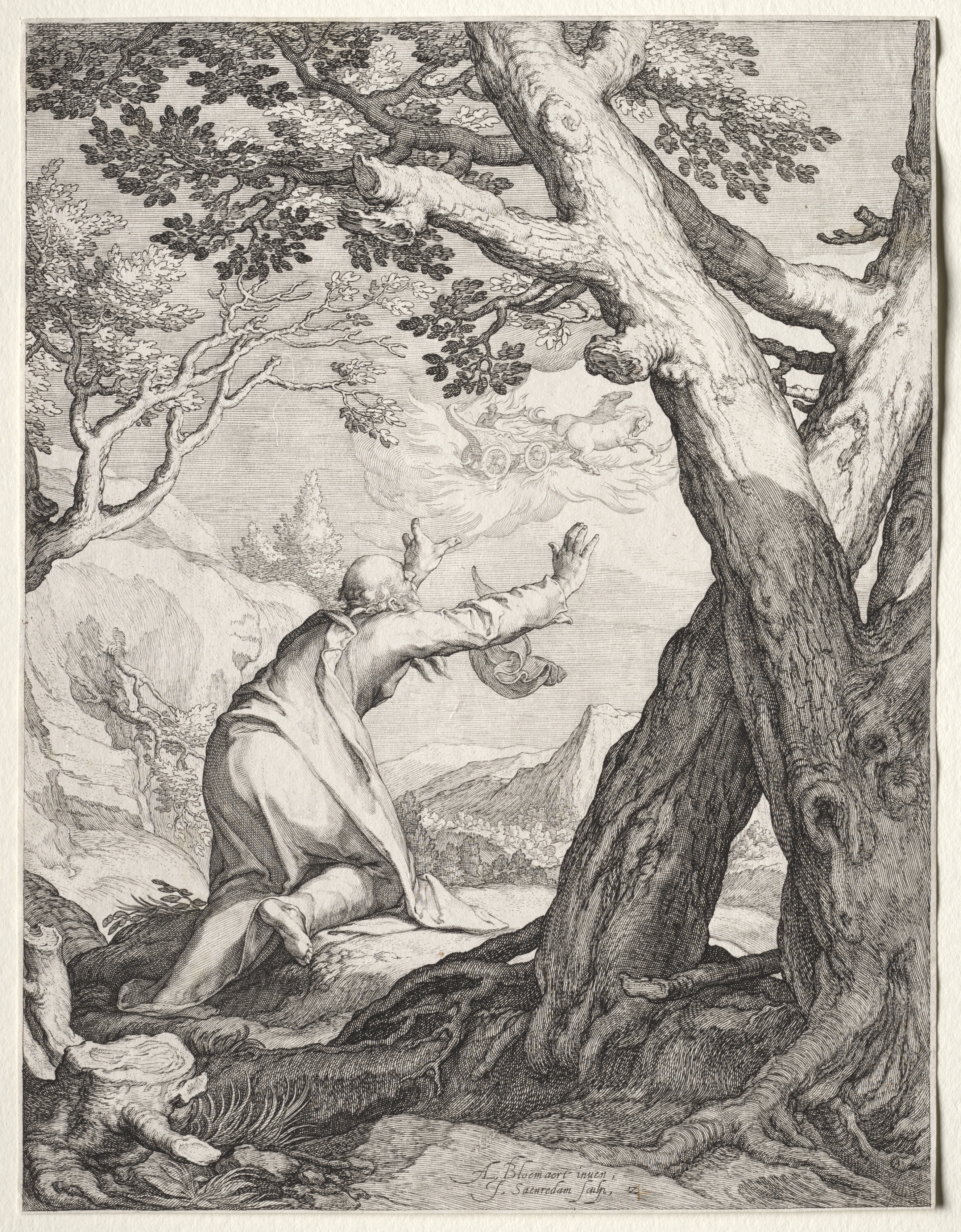 Black and white image of Elisha and Elijah's Chariot of Fire by Jan Saenredam. The image shows a man on one knee on the left side, dressed in a robe. The man has his arms outstretched toward a chariot in the air. The chariot is in the sky above, surrounded by a cloud and pulled by horses. The man appears to be looking up at the chariot. There are trees on the right side, one with a large trunk. In the background, there are mountains and more trees. The image has a border around it. The image depicts a biblical scene.