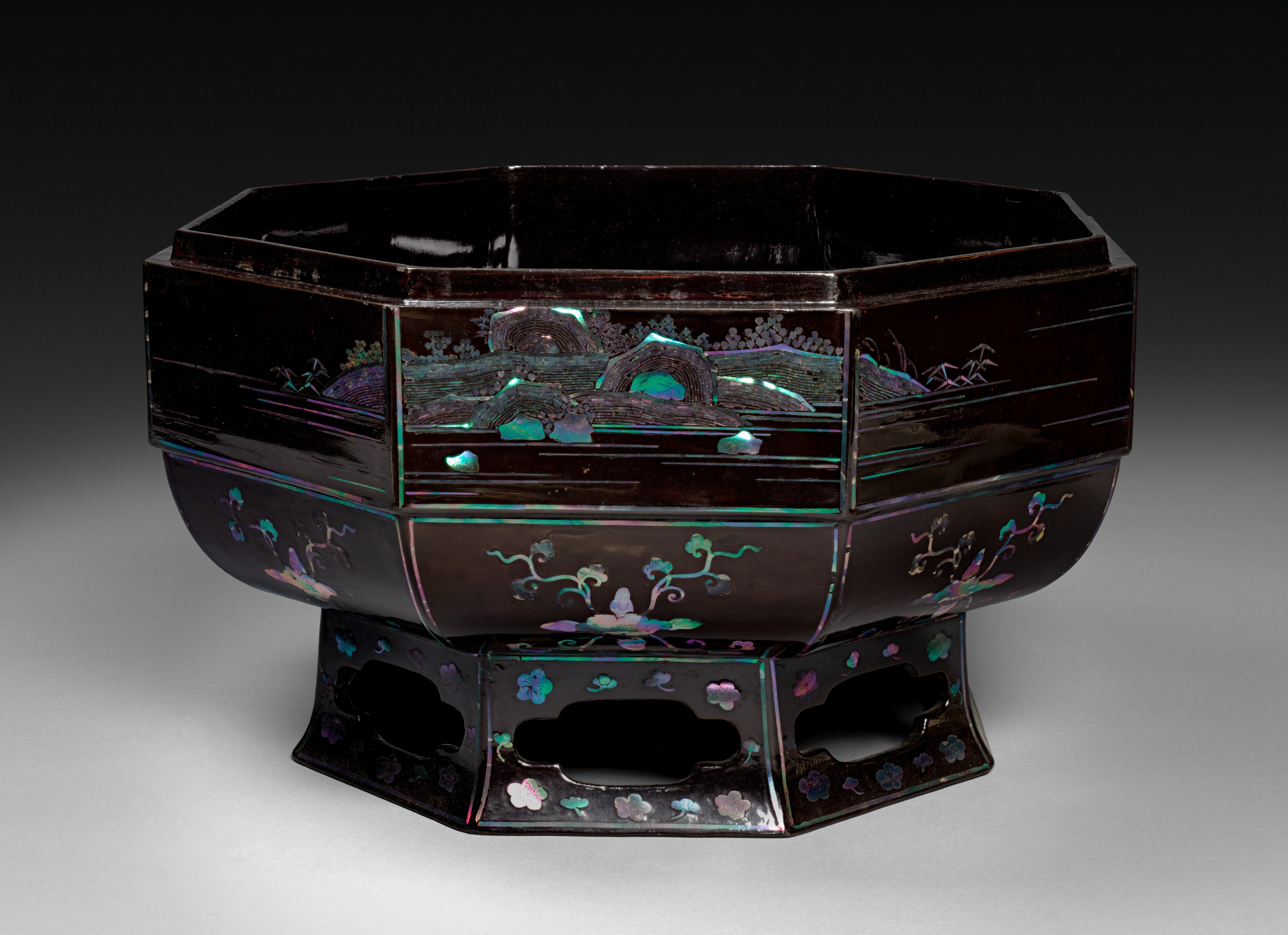 Octagonal Food Box by Artist Unknown. Dark brown octagonal box with a wide mouth and short base, featuring a flat top and slightly curved sides. The box sits on a short, curved stand with an octagonal base. The entire piece exhibits a glossy finish and showcases intricate designs. The box's body displays horizontal lines forming panels, with four central rectangular panels depicting scenes in shades of green, blue, purple, and pink. These panels are separated by narrower horizontal-lined panels. The lower section features designs of flowers and vines in shades of green, blue, purple, and pink. The base of the stand is adorned with small floral designs matching those on the body. The background transitions from dark at the top to light gray at the bottom.