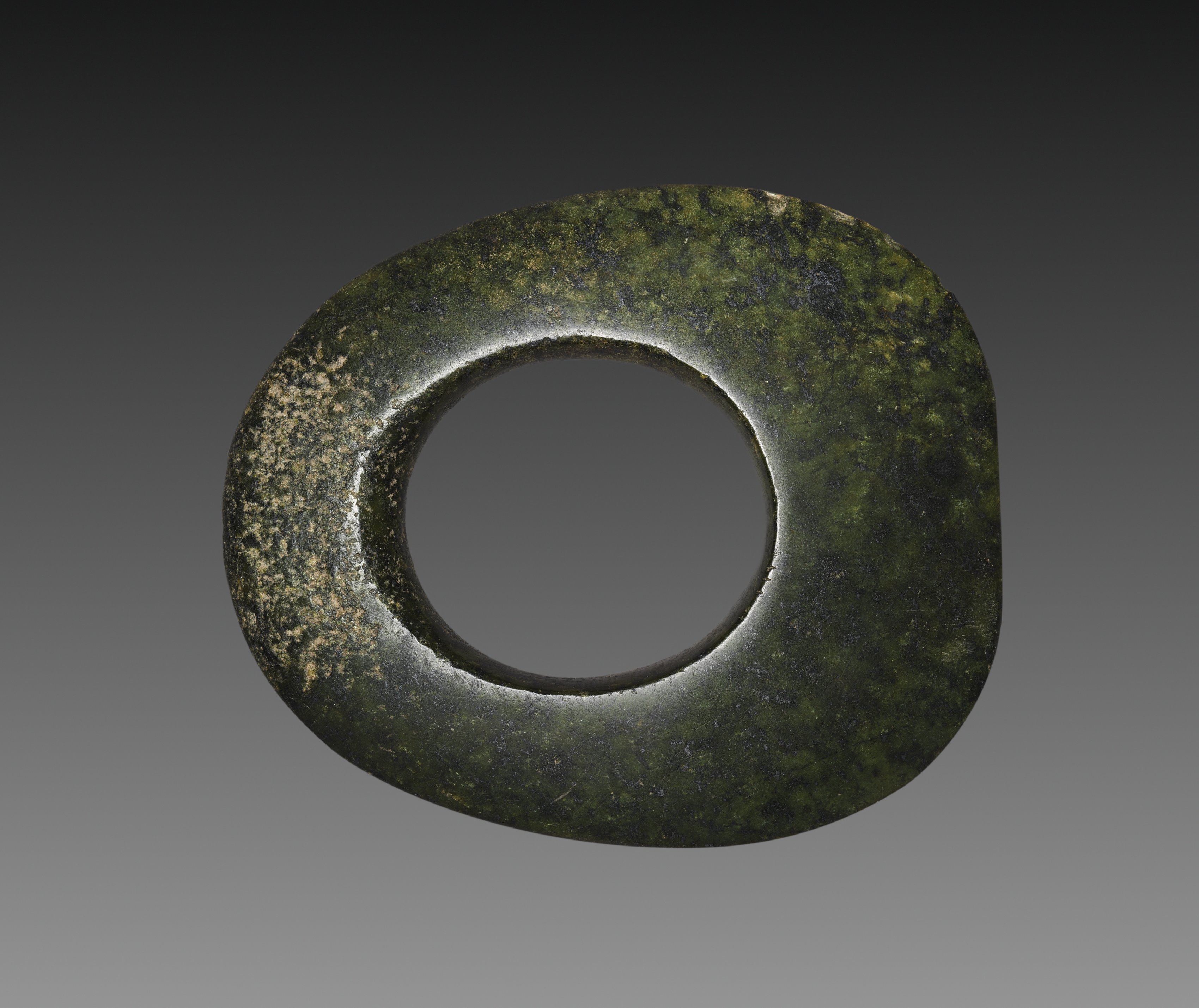 The Ceremonial Disk-Axe (Yue) by an unknown artist is a dark green, rounded rectangular object with a large circular hole in the center. The object has a rough texture and is primarily dark green with yellow and black speckles throughout. The rounded rectangle has rounded corners and slightly curved sides. The circular hole in the center is smooth and has a beveled edge. The background of the image is a gradient that transitions from dark gray at the top to light gray at the bottom.