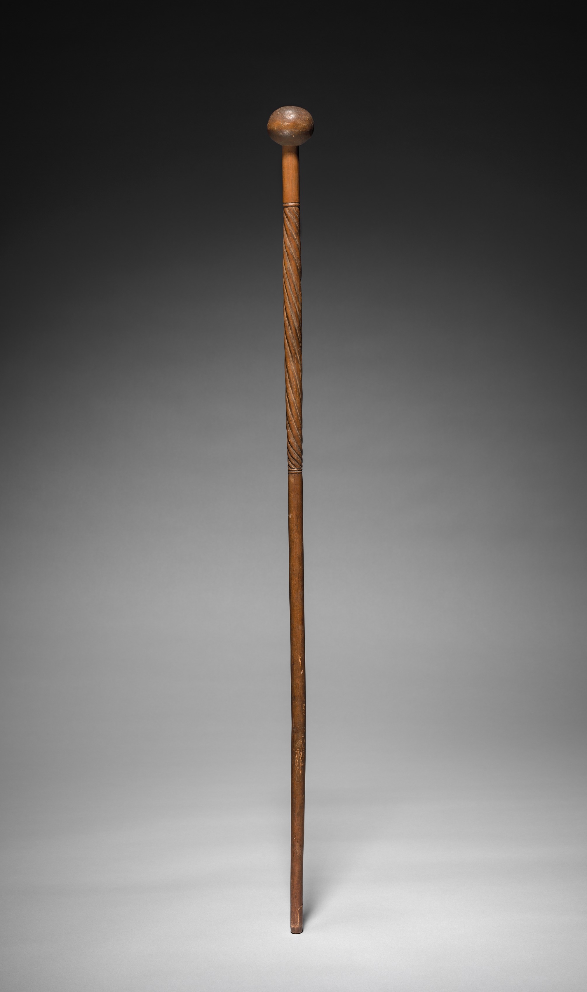 The image shows a wooden baton by artist unknown. The baton has a rounded knob at the top. The knob is spherical and smooth. The handle is long and cylindrical with diagonal grooves. The background is dark at the top and light at the bottom in a gradient from black to gray. The baton stands upright on a white surface. The overall color of the baton is brown with variations in tone.
