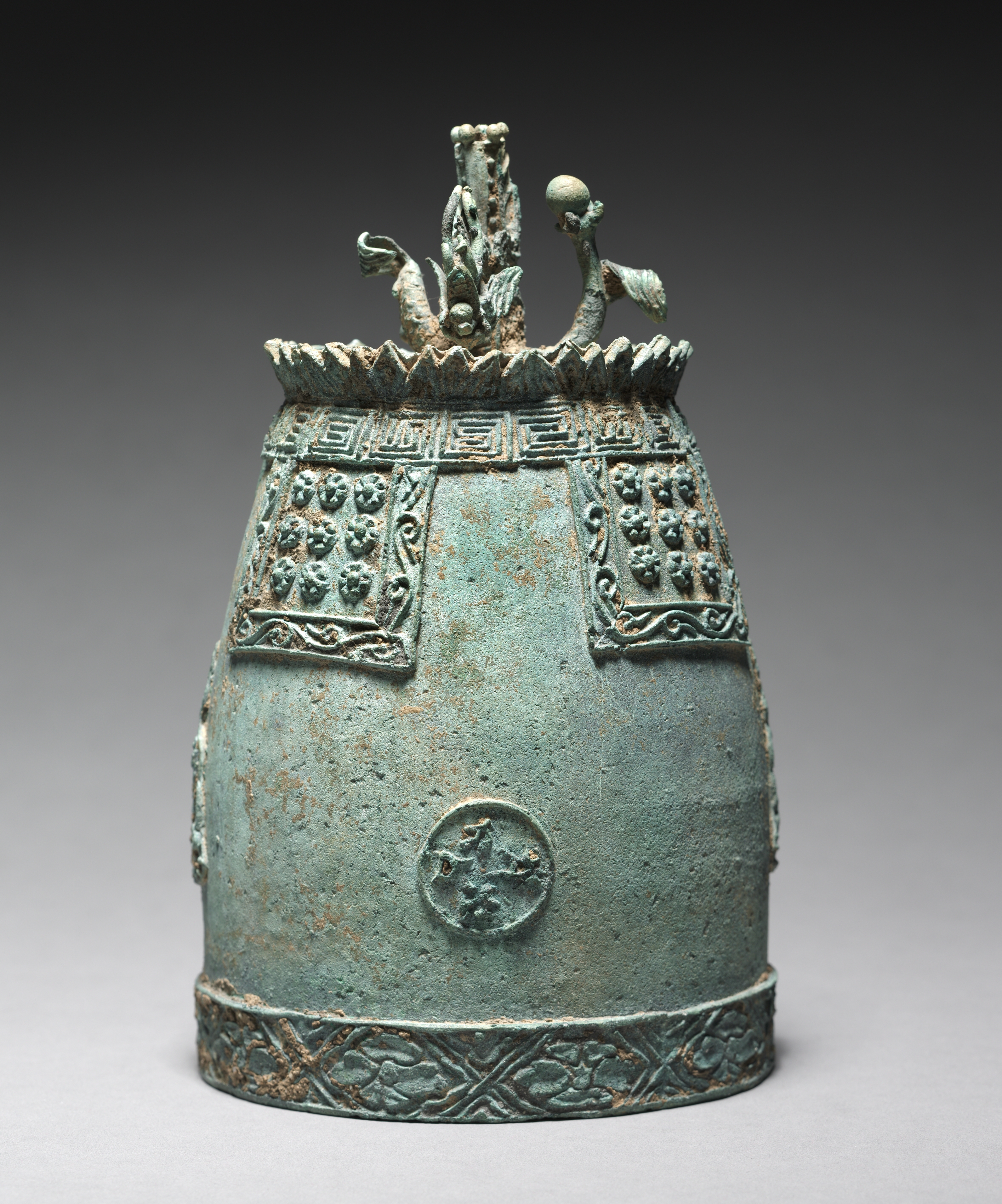 The Bronze Ritual Bell is a greenish-blue, bronze-colored object with a wide base that tapers towards the top. The bell has a circular base with an etched design around it, and a circular emblem on the front. Two rectangular panels with raised dot patterns and ornate borders are on either side. The top has a serrated edge with a sculpture of two figures and a vase-like object in the middle. The background of the image is dark gray at the top and light gray at the bottom.