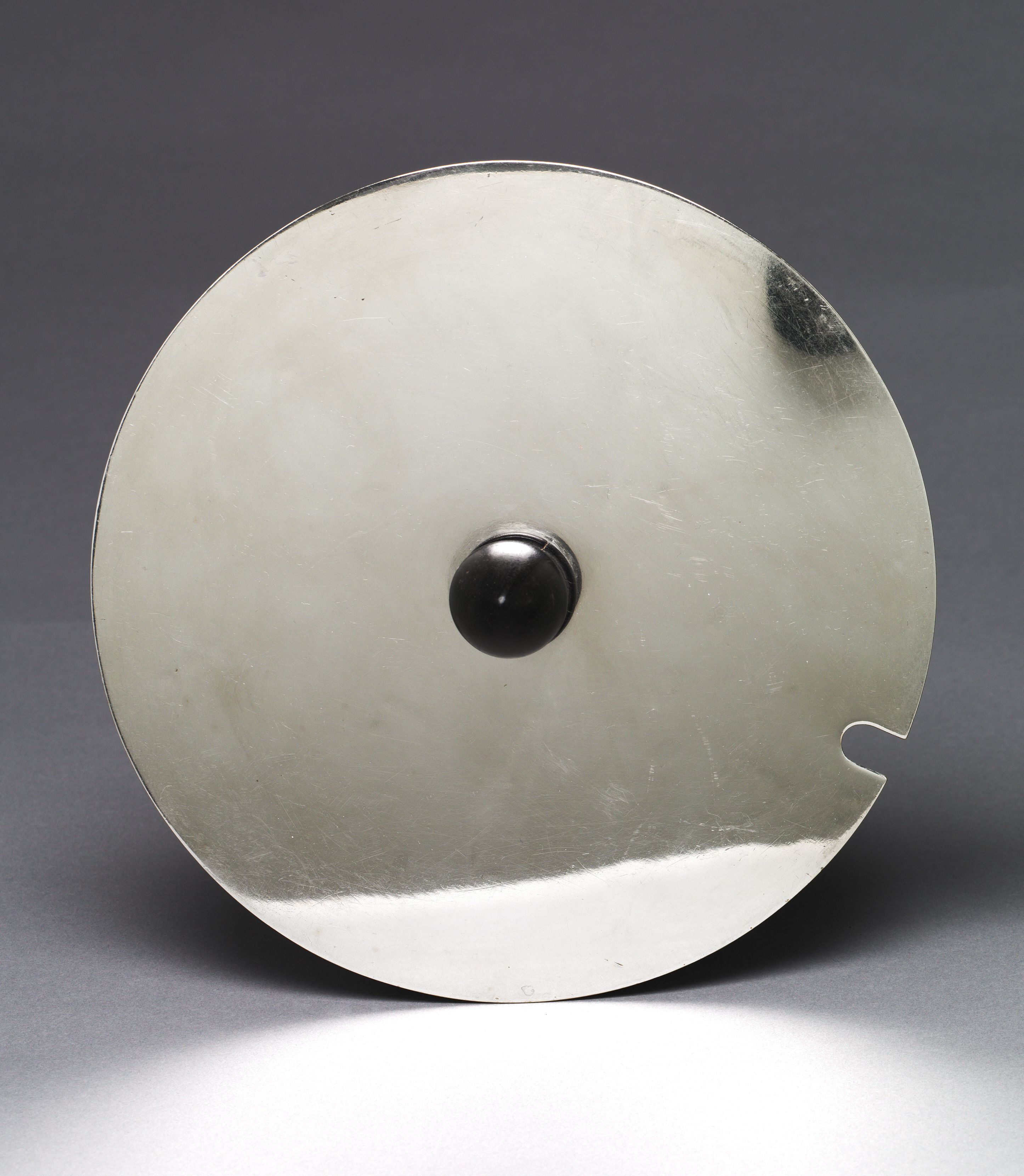 Round silver-colored metal object with a small notch on the right side. The object is circular and flat with a raised edge. A small black circle is attached to or part of the object in the center. The object has a smooth surface with some scratches and marks visible. The background is dark gray with a lighter gray surface that the object is sitting on. A shadow is cast to the left of the object.