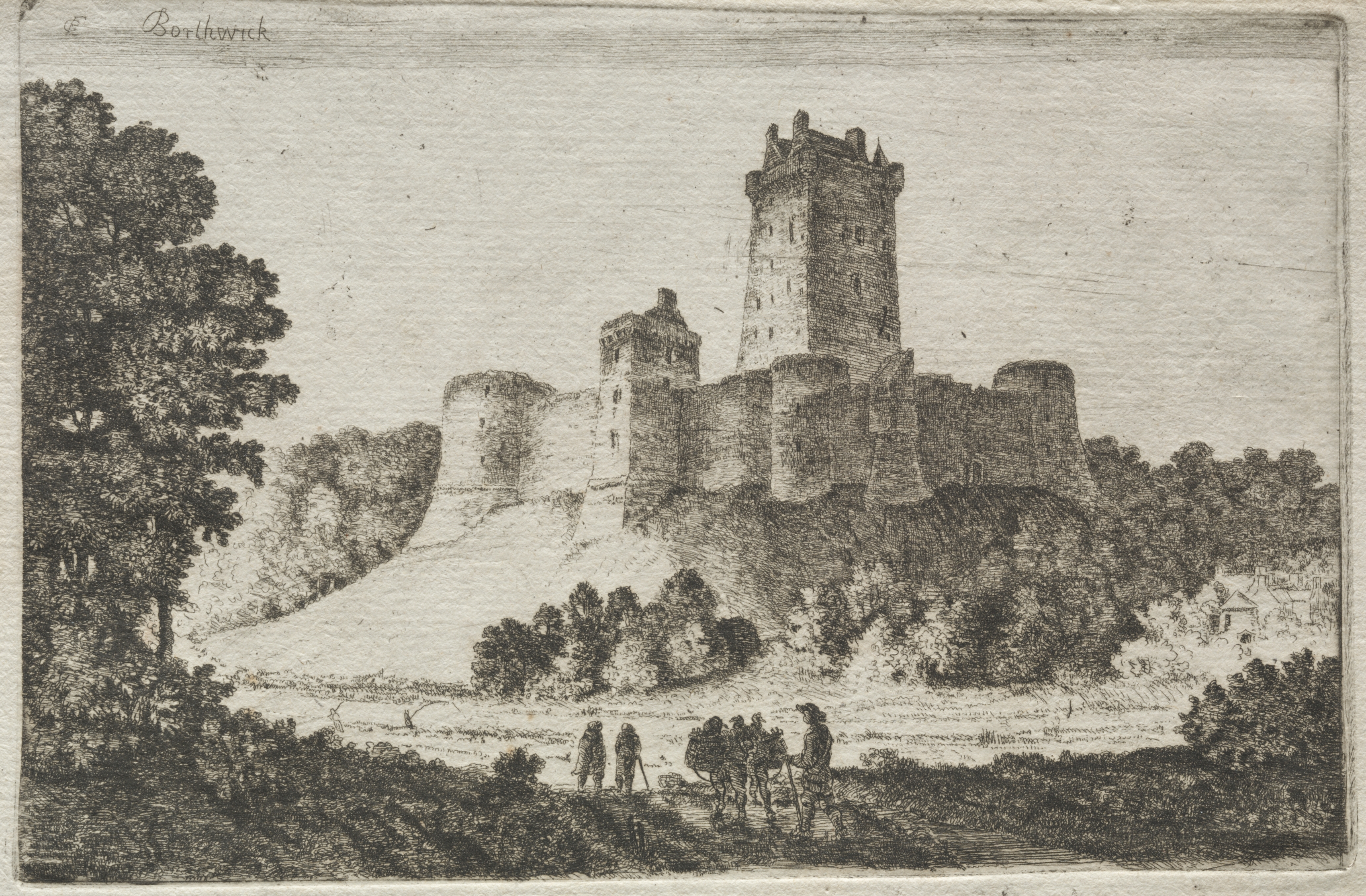 The image depicts a black and white drawing of a castle. The castle sits on a hill. The castle has a tall tower on the right side and a shorter tower on the left. There are trees around the castle and in the foreground. In the foreground, three people stand in a field. The people are wearing old-fashioned clothing. A large tree is on the left side. The sky is clear. The castle and trees are drawn in dark shading, and the field is lighter. The artwork is titled "Borthwick Castle from the East" by John Clerk of Eldin.