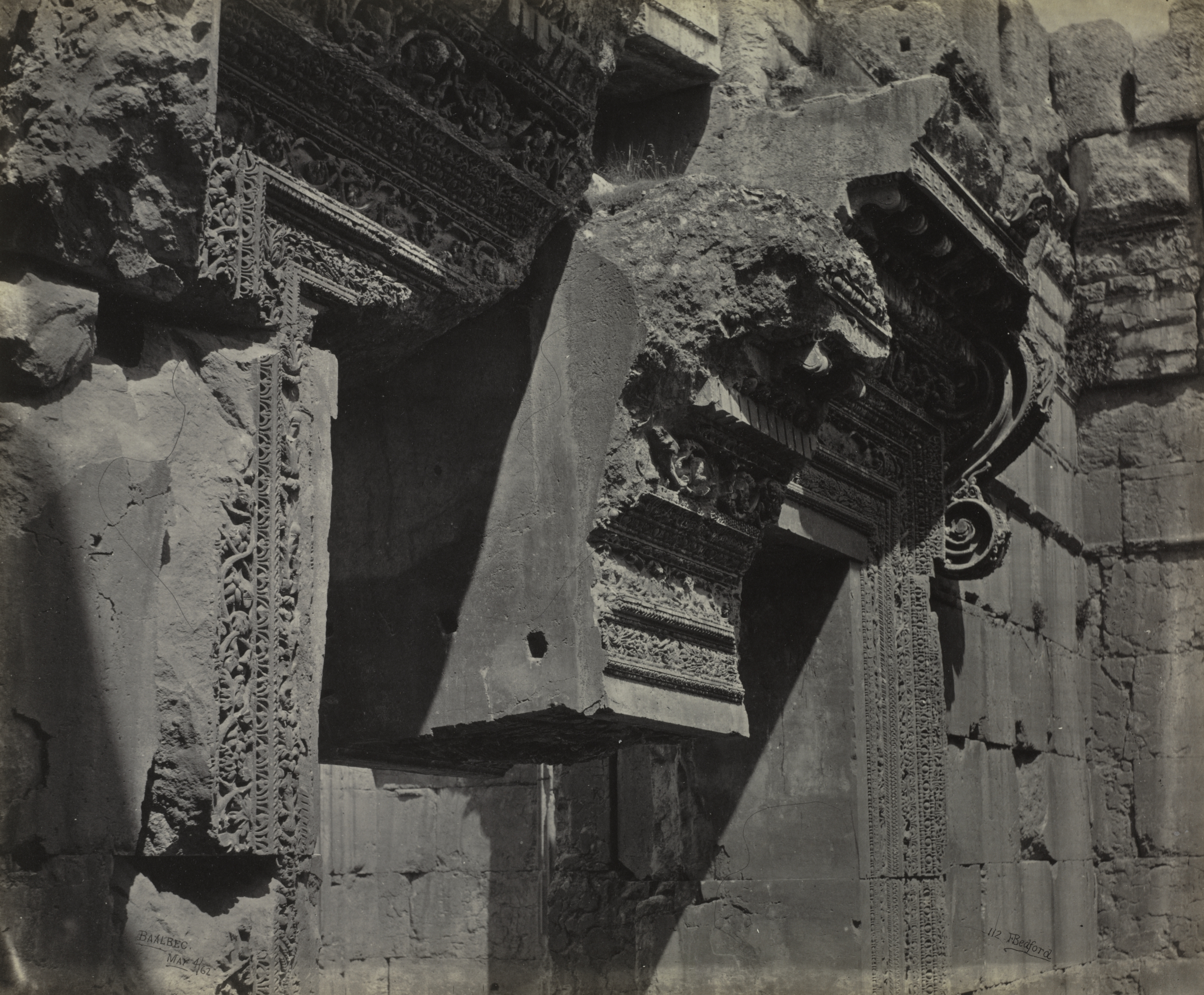 Black and white photograph of crumbling stone architectural elements. The main visible feature is a damaged stone cornice protruding from a wall. The cornice consists of a flat, decorative stone piece supported by a thick, ornate bracket. The bracket features intricate carvings. The wall behind and beside the cornice appears constructed of large, rough-hewn stone blocks. Some blocks show evidence of deterioration and crumbling. Carvings adorn the edges of the cornice and possibly the wall. The overall appearance suggests an ancient structure in a state of partial ruin. Title: Balbec by Francis Bedford.