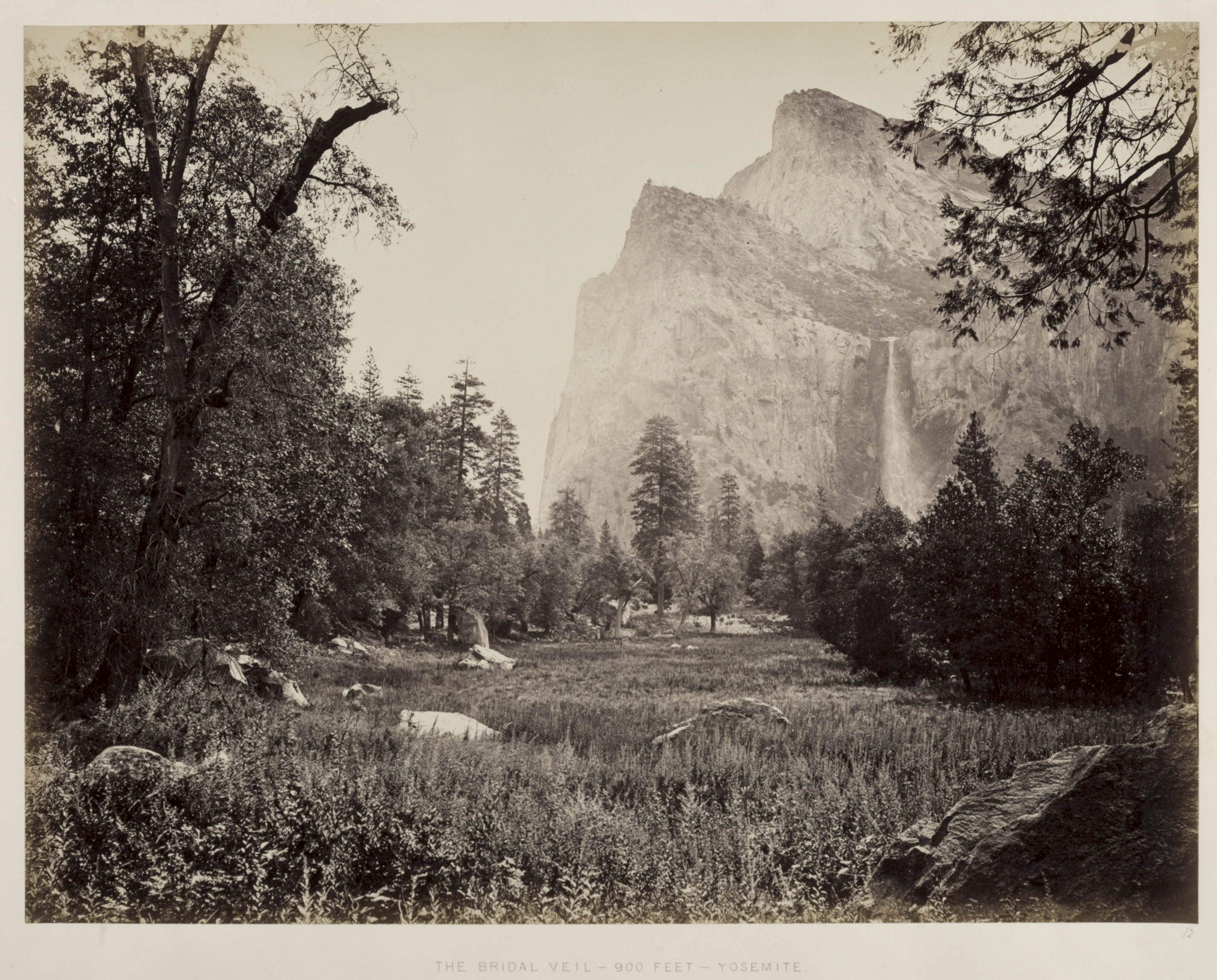 Black and white photo of a waterfall. Large rocky mountain face in background. Waterfall on right side of mountain. Trees on left and right. Open field in front. Waterfall cascading down.