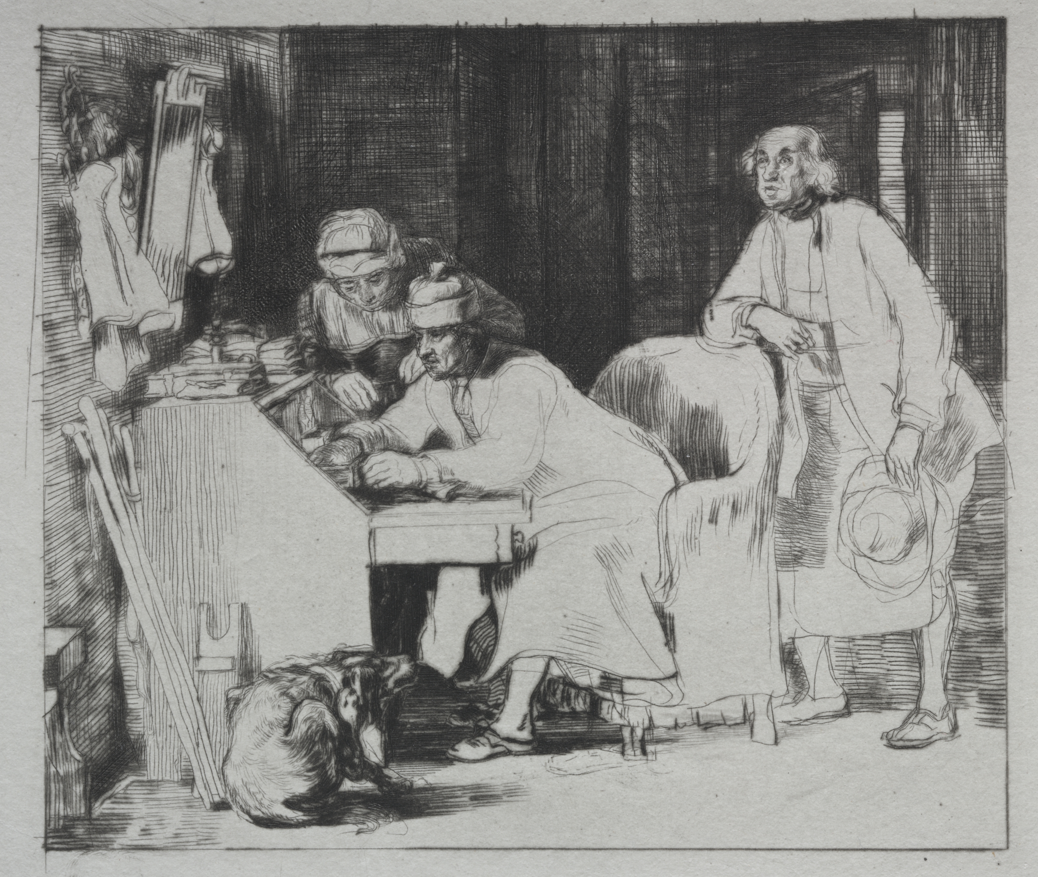 Black and white drawing of four men and a dog indoors. A man on the left side of the image stands next to a table with a large board on the table and a long object leaning against the table. A dog sits on the floor to the left. Two men on the left side of the image look down at a piece of paper on a table. A man on the right side of the image stands and holds a hat. The room has dark shading on the walls. The Lost Receipt by David Wilkie.
