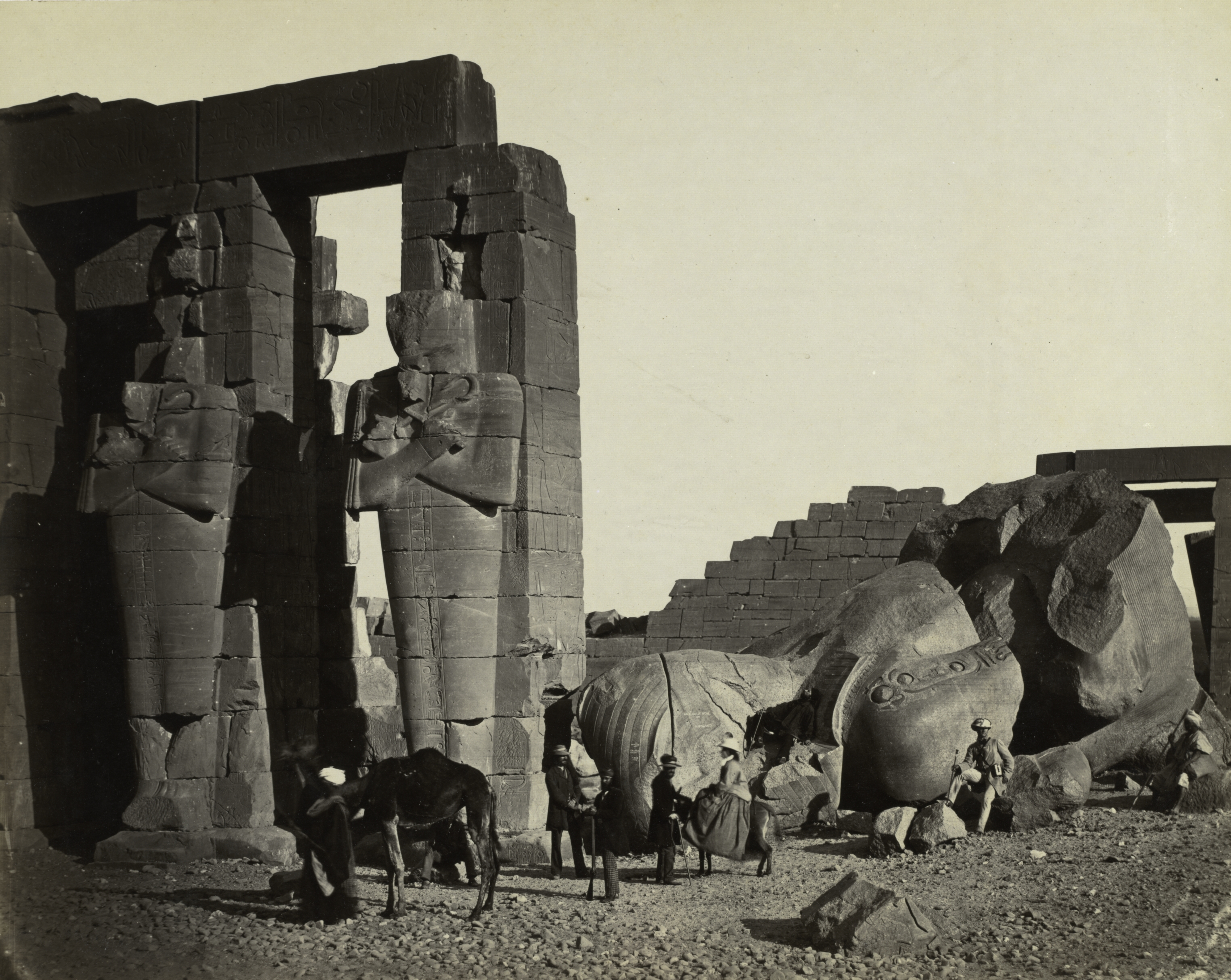 Black-and-white photograph of large stone ruins. Large stone structure on left with rectangular opening. Structure made of large square-cut blocks of stone. Blocks show signs of weathering and crumbling. Carvings on the structure. Two men on left and one man on right standing near donkeys. Large stone statue on right lying on its side. Statue appears to be of a human or deity with ornate headdress. Part of a staircase on right. Ground covered in small rocks and pebbles. Sky is clear and light-colored.