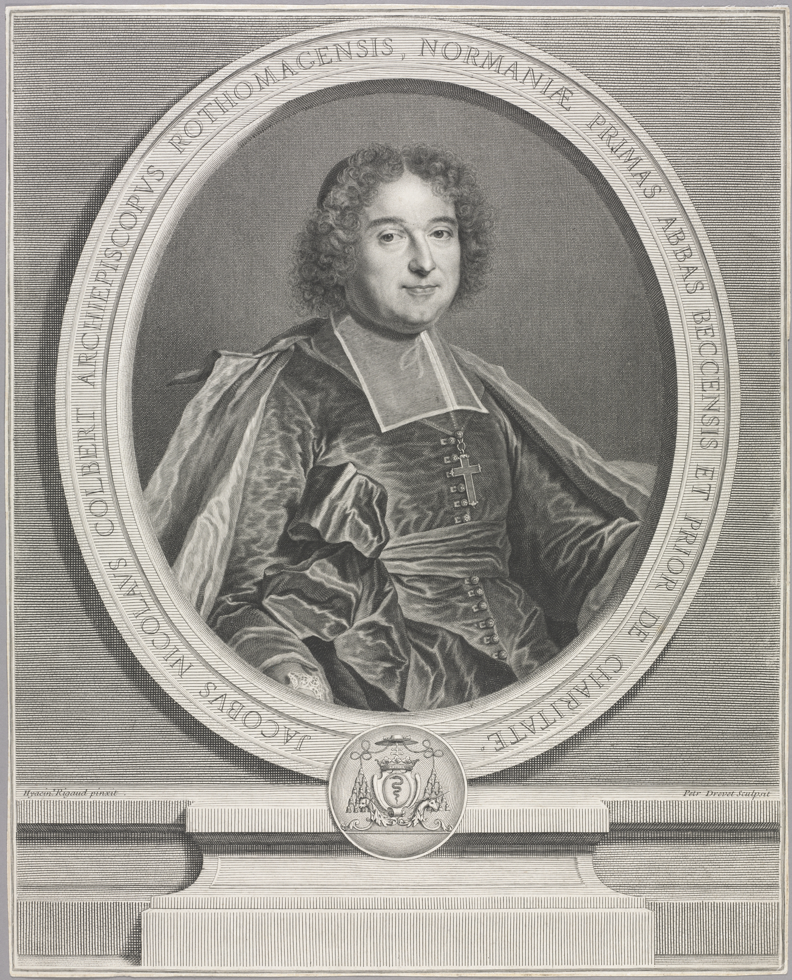 Oval frame containing a portrait of a man with curly hair, wearing a dark-colored robe with lace trim and buttons down the front, and a cape draped over his shoulders. The frame has a rope-like border and an inscription around the edge. A coat of arms is at the bottom center of the frame. The background of the image features a wall with horizontal lines.