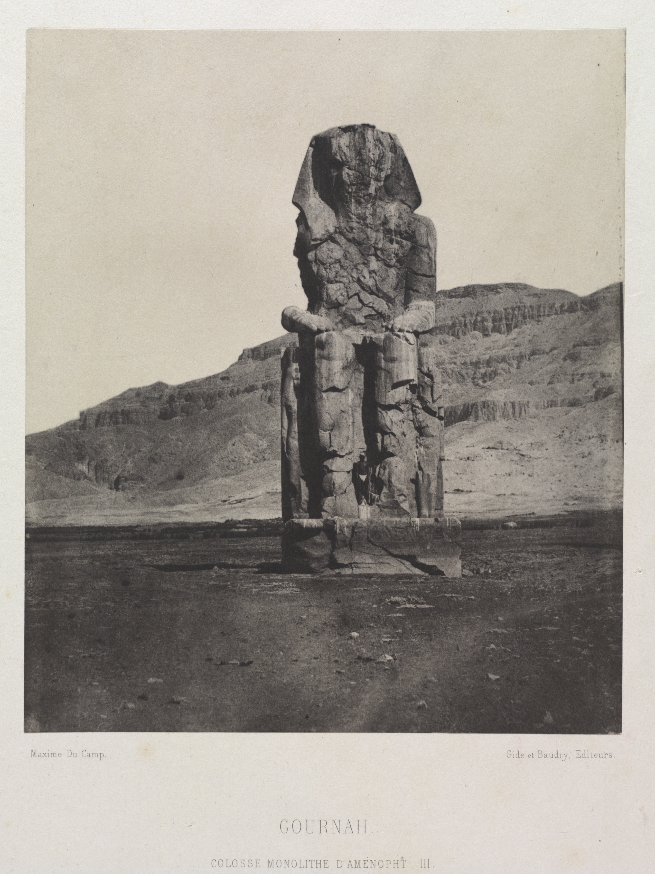 Black and white photograph of a large stone statue. The statue is a colossal monolith depicting a man with a pharaonic headdress. It has a large stone body with cracks and deterioration visible. The statue faces left. It stands on a flat, dark area of ground. There are mountains in the background. The sky appears clear. The photograph has a white border with writing at the bottom.