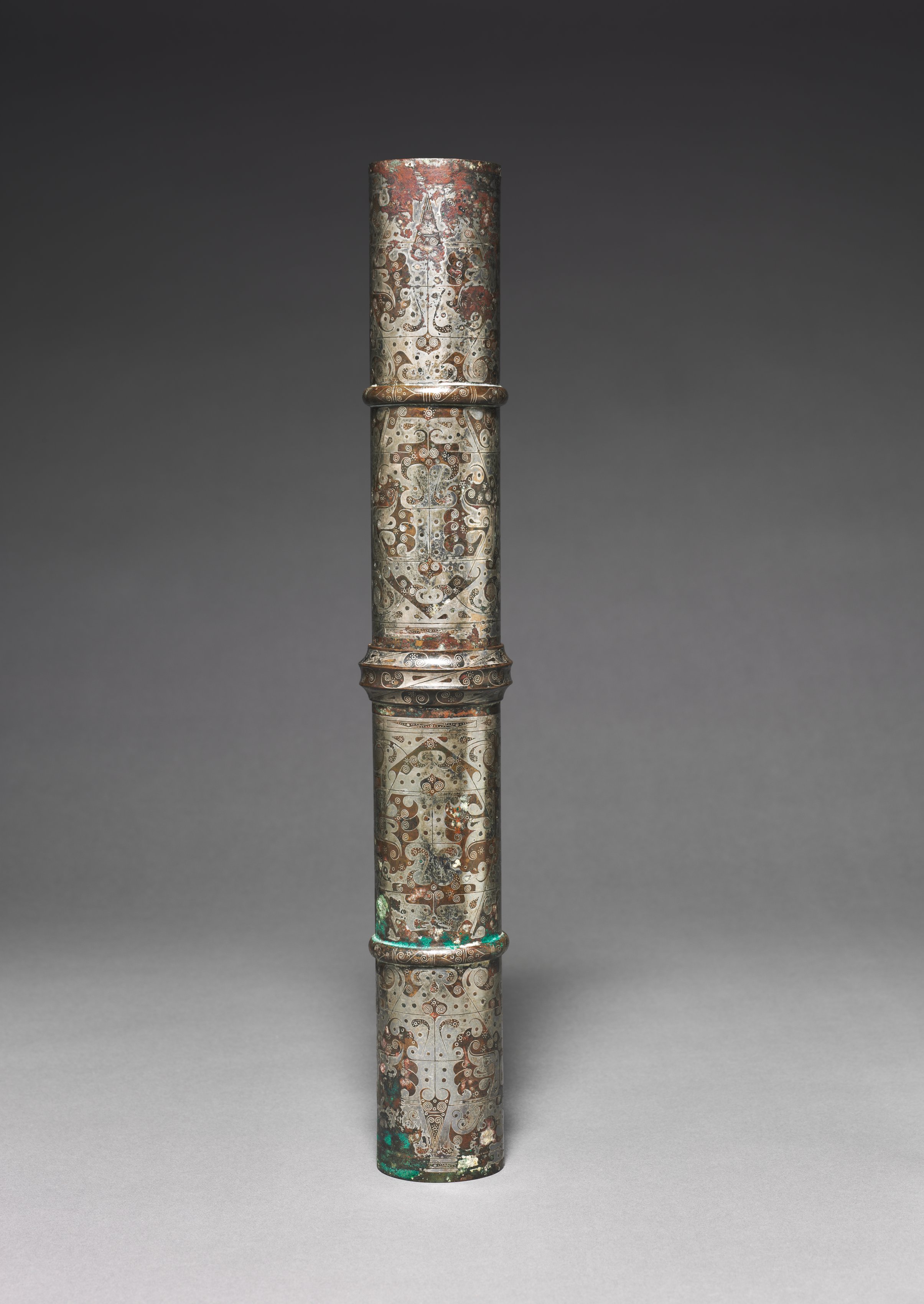 The Chariot Canopy Shaft by an unknown artist is a cylindrical object divided into three sections of roughly equal length. The object is made of a material that appears to be metal and has a predominantly white and brown coloration with some red areas. There are intricate patterns and designs etched or painted onto its surface. Two raised rings encircle the object, one near the top and one near the bottom. The object has a worn and aged appearance, and there is a greenish tint at the bottom. The background of the image is a gradient that transitions from dark gray at the top to light gray at the bottom.