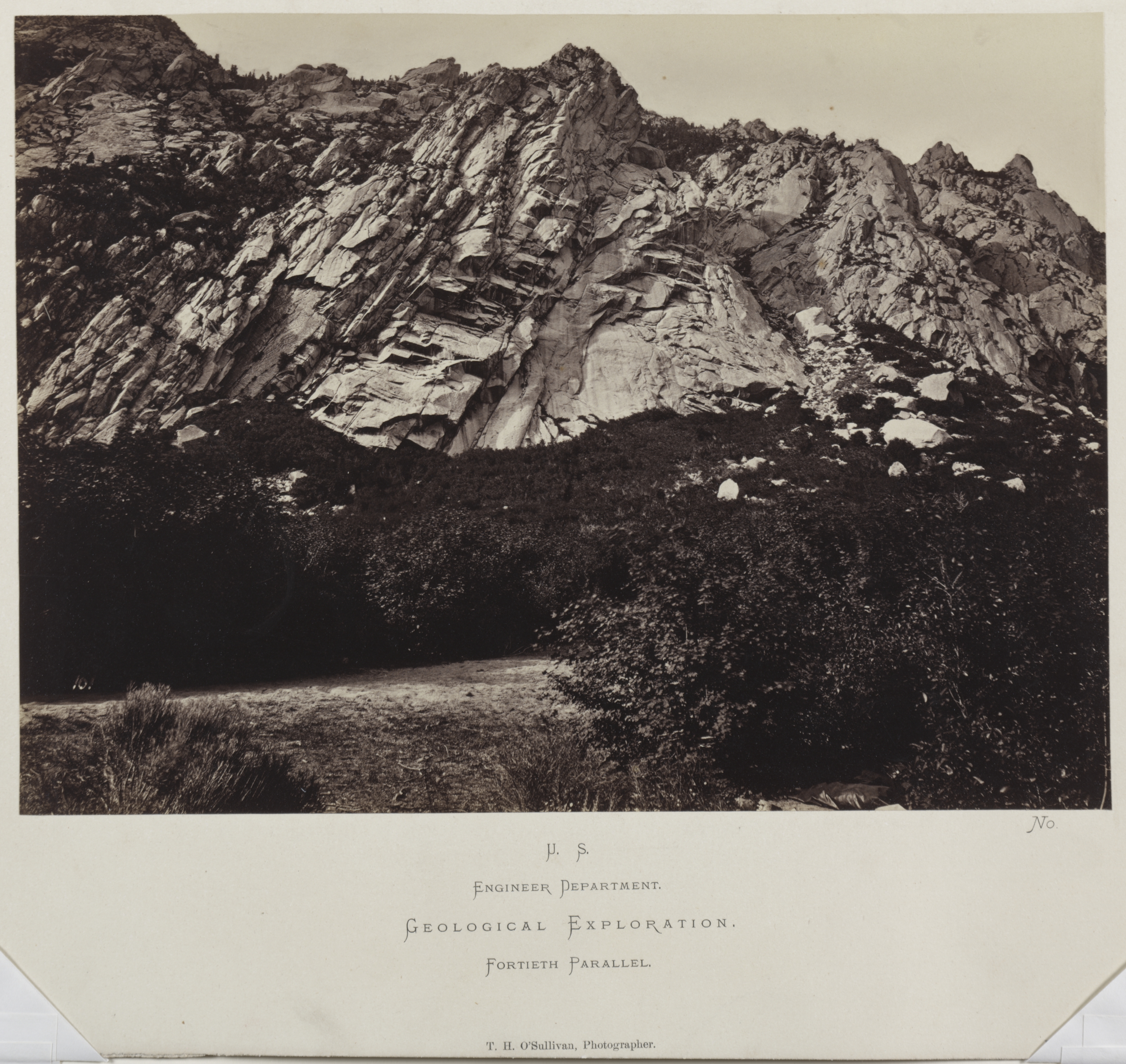 Black and white photo of a rocky mountain with a dirt path and trees in the foreground. The mountain is large and takes up most of the photo. It has many jagged peaks and steep slopes. The mountain is made of light-colored rock with darker shadows. There are trees and bushes in the foreground, along with a dirt path that leads to the base of the mountain. The sky above the mountain is light-colored. The photo is mounted on a beige background with text at the bottom.