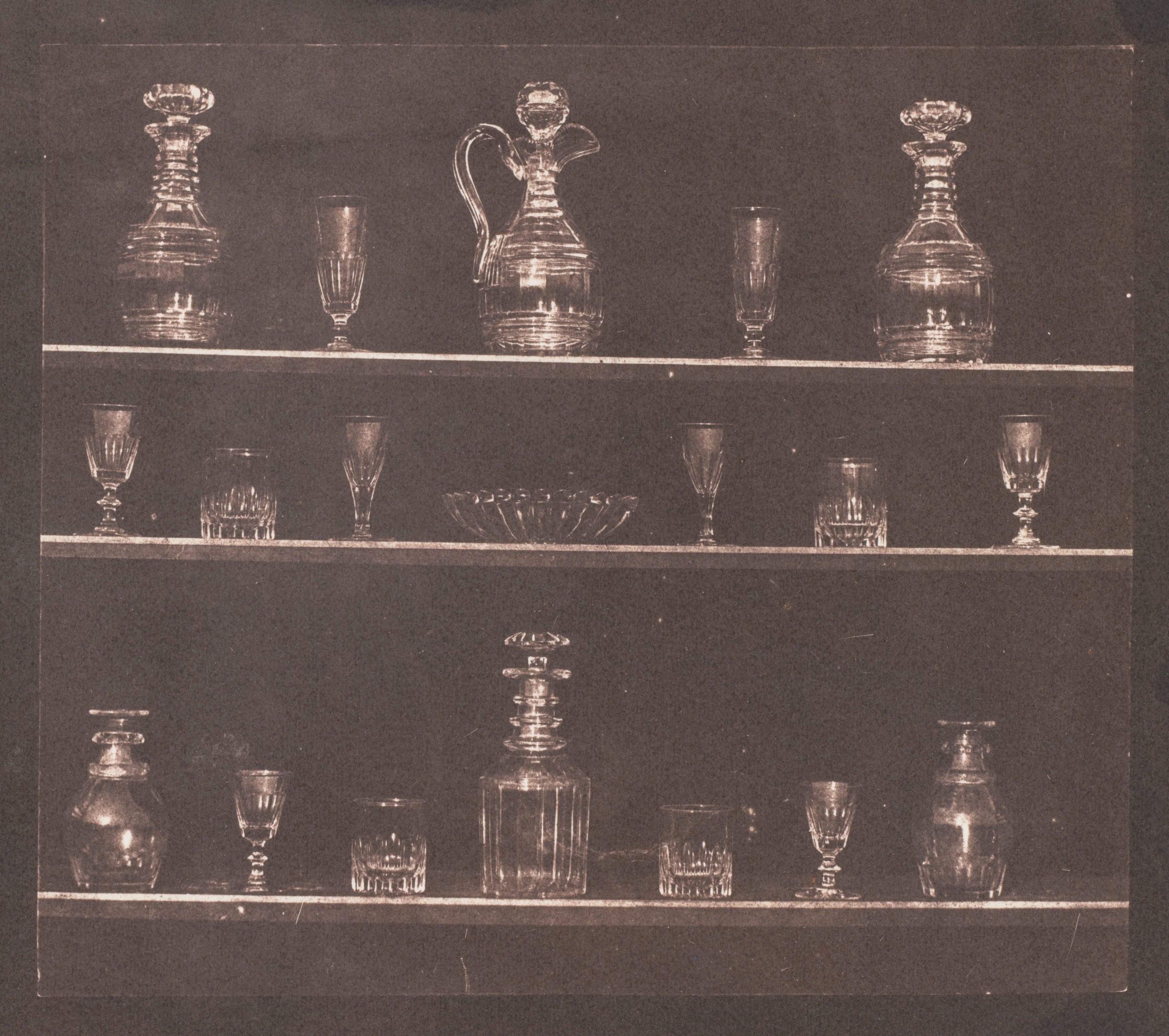 Two shelves with glassware on them. The top shelf has 8 items and the bottom shelf has 7 items. The top shelf, from left to right, has a clear glass decanter with a short neck; a short, clear glass with vertical lines; a decanter with a handle; another short glass; a clear glass decanter with a short neck; a short glass; and a clear glass decanter with a short neck. The bottom shelf, from left to right, has a clear glass decanter with a lid; a clear glass; another clear glass; a clear glass decanter with a lid; a short clear glass; a small clear glass; and a clear glass vase. Background is dark. Title: Articles of Glass. Artist: William Henry Fox Talbot.