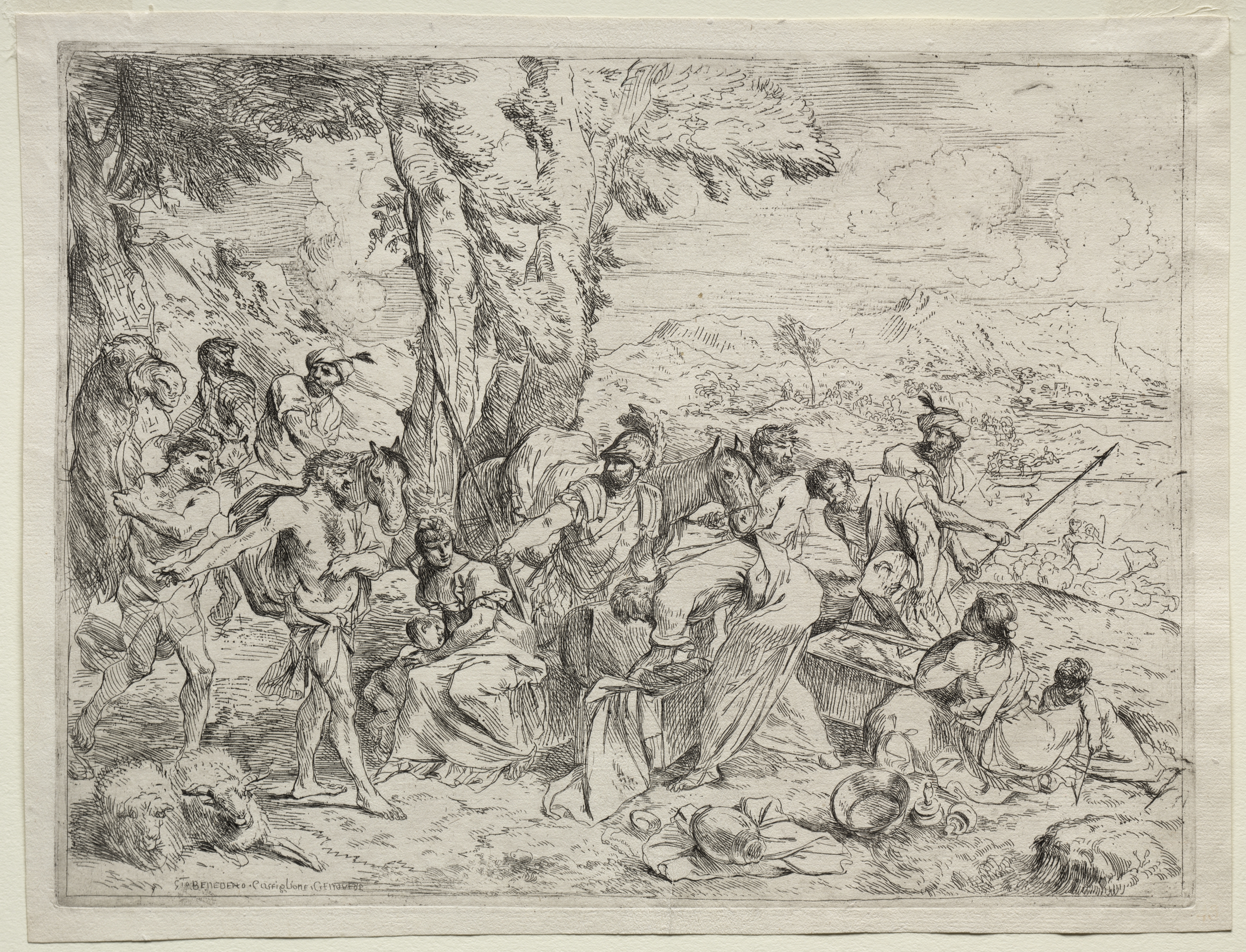 Black and white drawing of a group scene. Several men in ancient dress gathered around, some standing and some sitting on the ground. The scene depicts a group rummaging through baggage. A horse's head is visible behind the group on the left. The background includes rolling hills, trees on the left, and a cloudy sky. The border around the drawing is off-white. The scene depicts Laban searching for idols in Rachel's baggage. The style is detailed and uses a lot of shading. The drawing is by Giovanni Benedetto Castiglione.