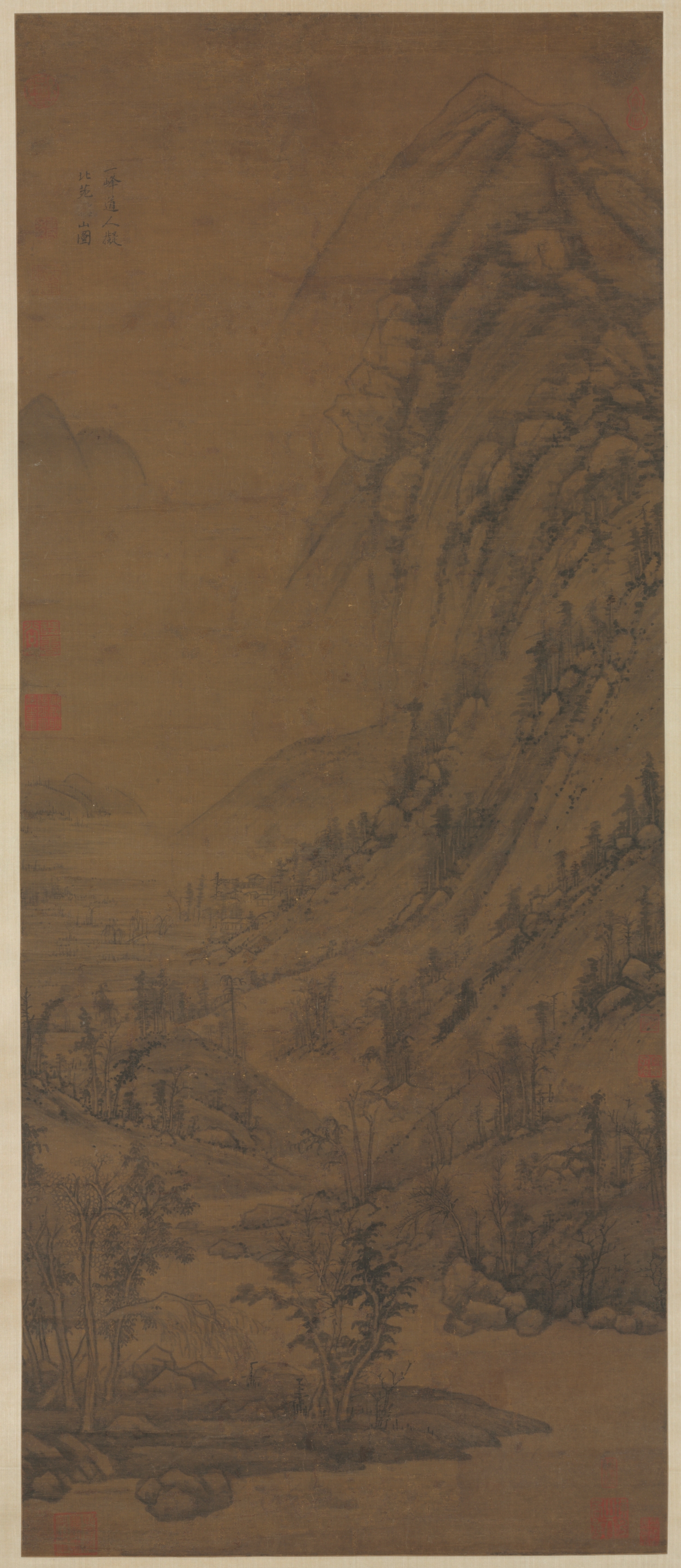 Landscape painting on vertical rectangular paper. The dominant color is brown. The right side features a steep sloping mountain with jagged lines. Trees are scattered across the slopes and some are bare. The left side depicts a more distant mountain range with softer lines. Trees are visible in the foreground. The background shows a hazy sky. Chinese characters are written in black ink at the top left corner. Red seals are stamped on the left and bottom right corners. The edges have a beige border.