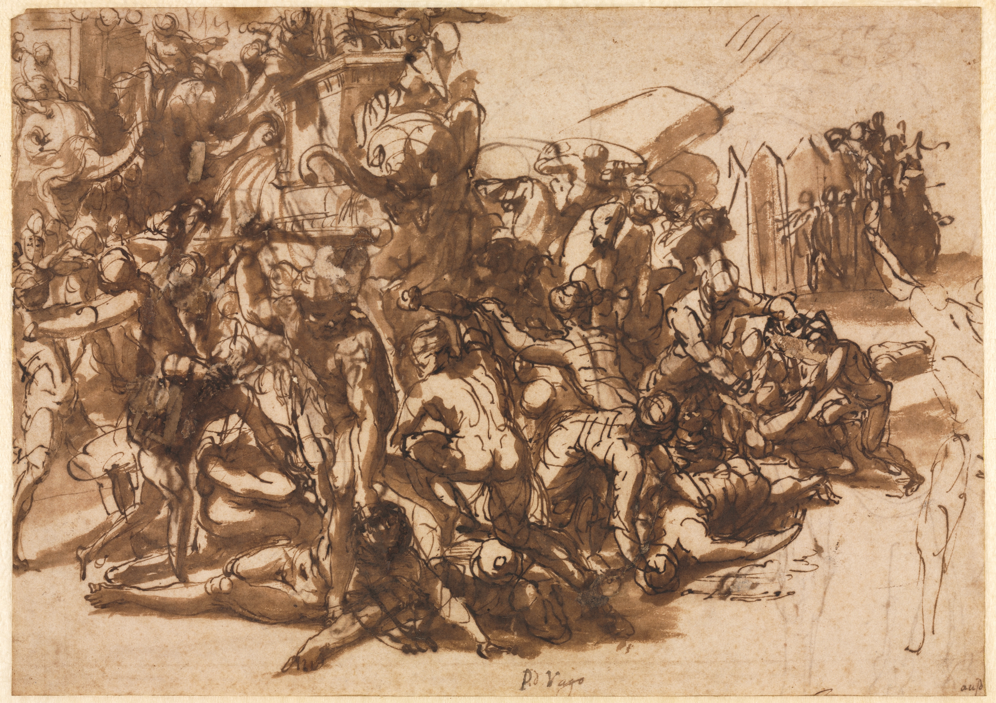 Brown and sepia-colored sketch on aged paper depicting a chaotic battle scene. Multiple men are on the ground in various positions, some on their backs with legs in the air, others on their stomachs or sides. Several men are standing or climbing over the fallen, some with their arms raised. A few men on horseback are at the top and left side of the image. A group of soldiers on foot wielding spears or other weapons stand at the far right. The background shows a flat, possibly urban setting, with some rectangular structures visible. The artist's signature, "P. D. Vaga," is at the bottom center.