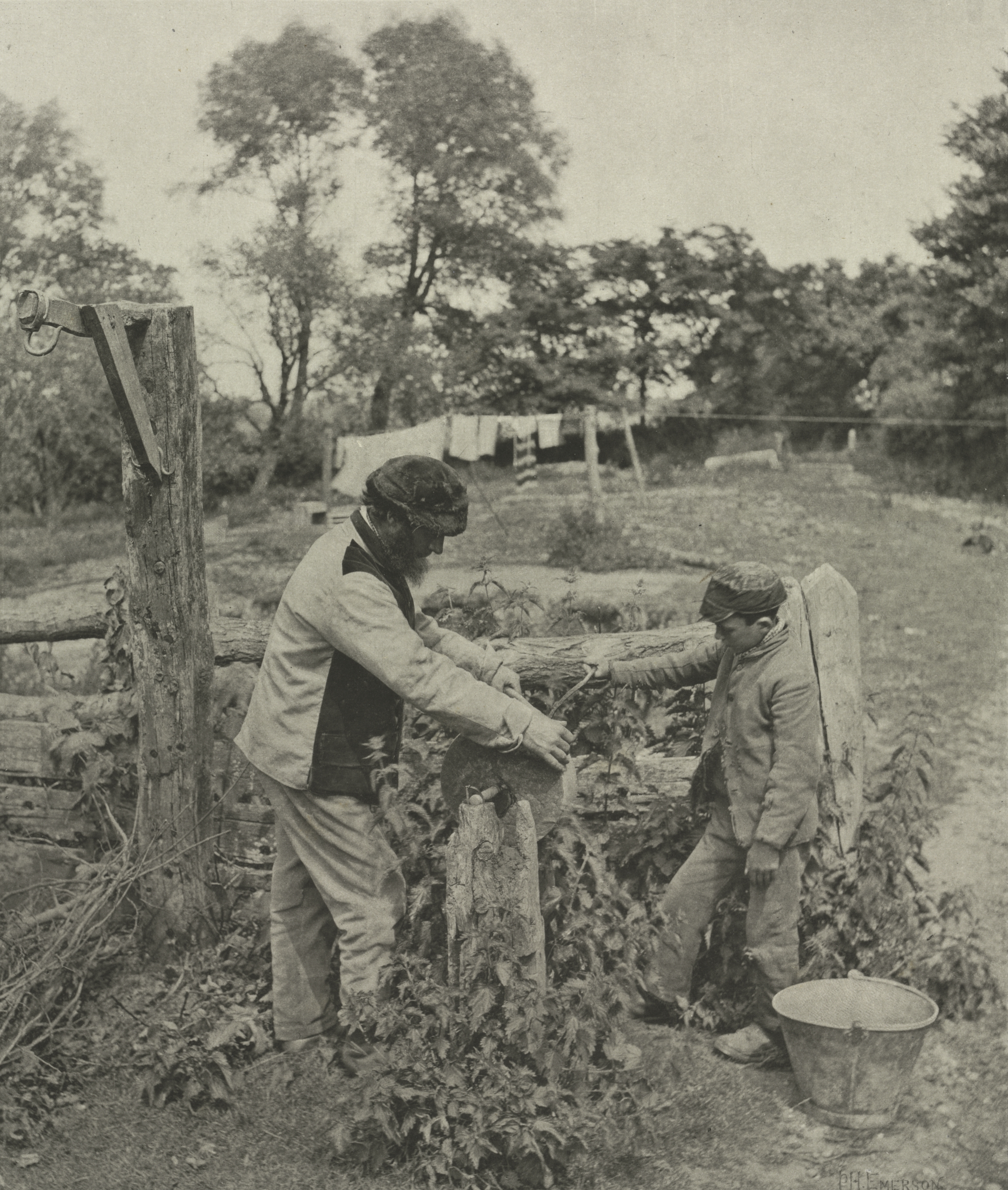 Black and white photograph of two men working with branches at a grindstone in a farmyard. The man on the left wears a flat cap, a light jacket with a dark vest underneath, and light-colored pants. The man on the right wears a cap, a jacket, and pants. A large metal bucket sits on the ground to the right. In the background, there are trees, a field, and a fence with clothes hanging on a line. The scene depicts a rural setting with a grindstone, wooden fence posts, and a rustic atmosphere.