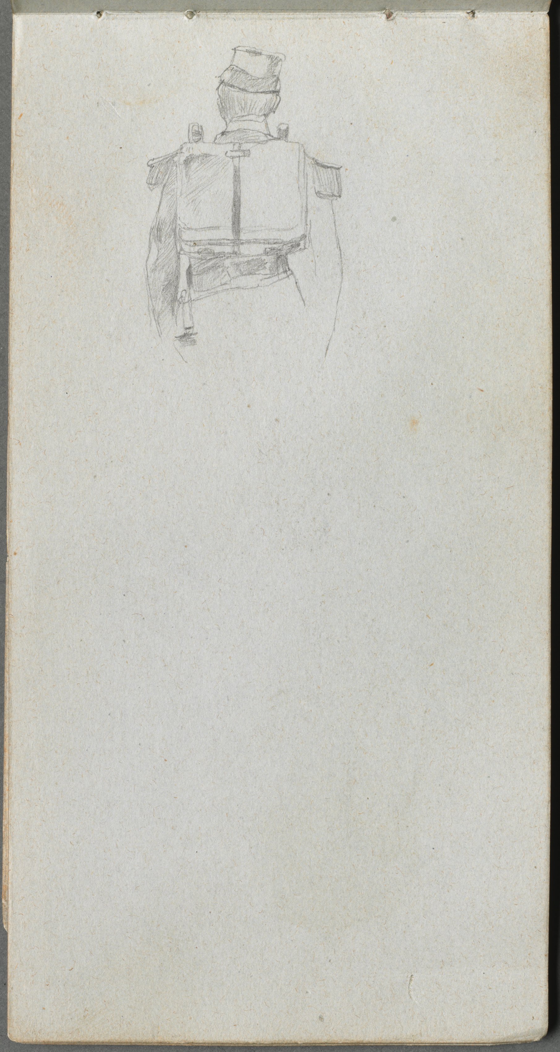 Pencil sketch on aged paper of a military figure viewed from the back. The figure wears a hat atop short hair, with epaulets on the shoulders of a jacket or coat. A large rectangular object or pack is on the back, secured by straps. The figure also wears a belt around the waist with a holster or scabbard on the right side. The paper shows signs of age with a slightly darker edge and lighter center. Small holes are punched along the top edge.