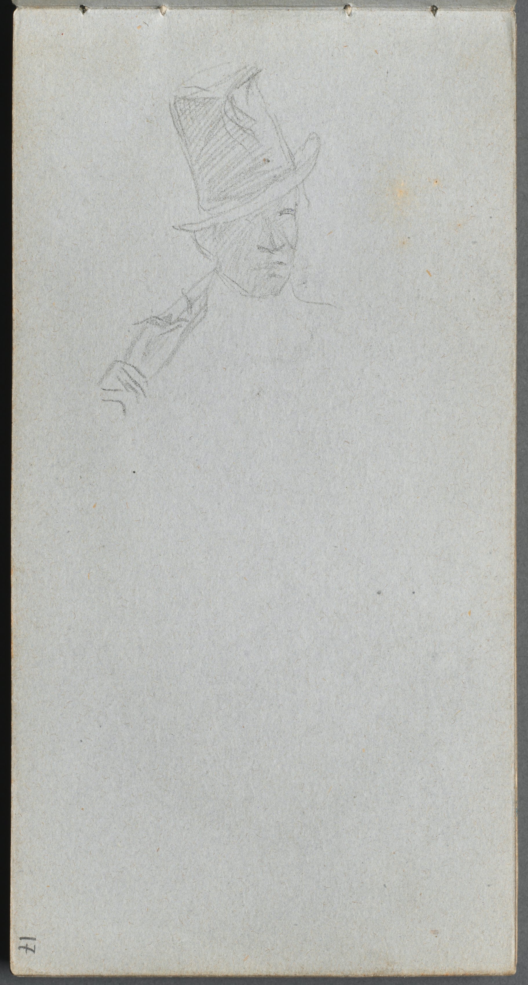 Pencil drawing on aged paper. The paper is off-white with small holes along the top edge. A faint pencil sketch of a man's head and shoulders is in the upper left. The man is wearing a tall top hat. The brim of the hat is curled up at the front and back. The man faces right, his head slightly tilted down. The shoulders are slouched. The paper has small dark spots and light brown stains. The page number '17' is written in black text at the bottom left corner.