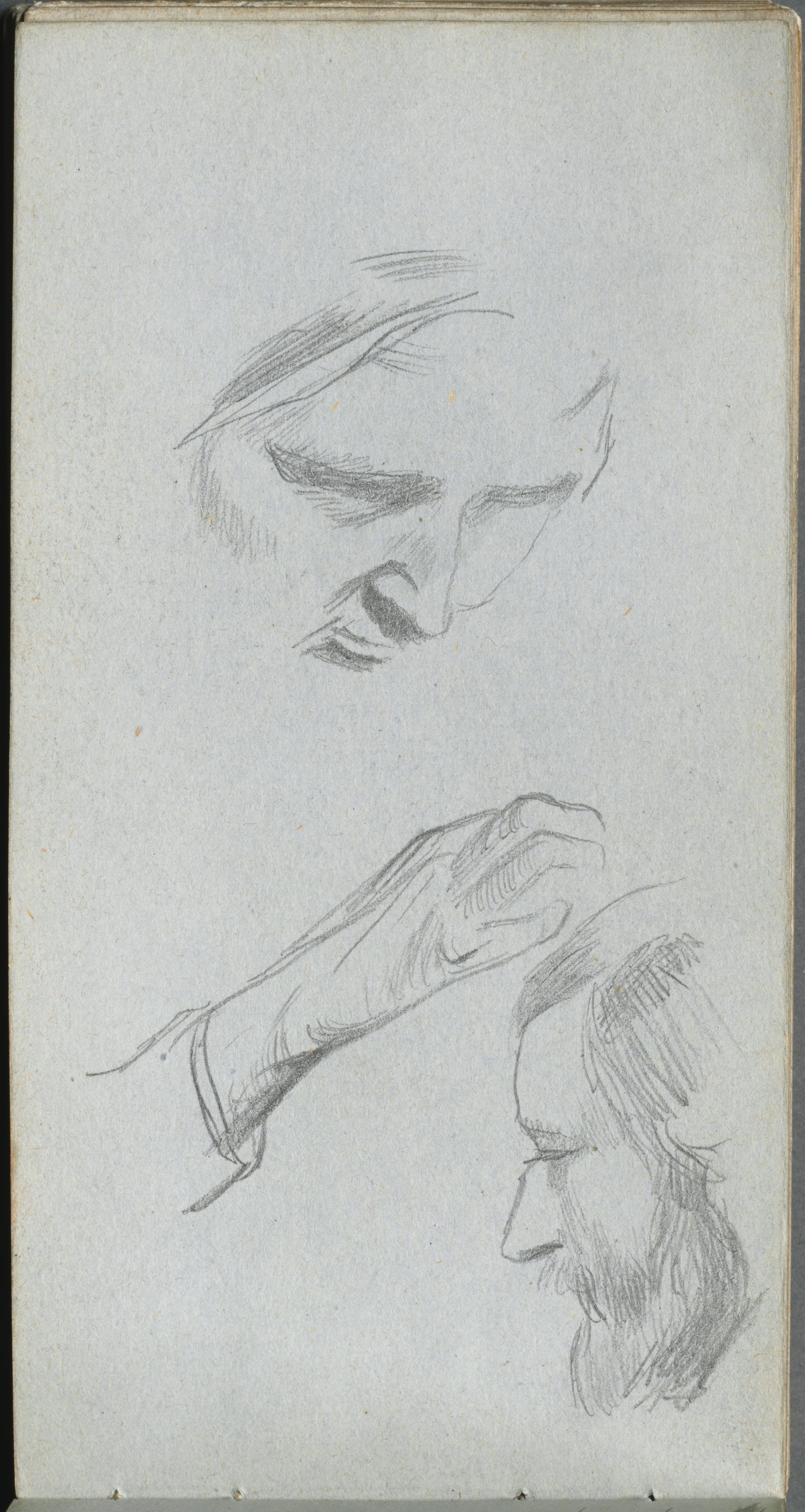 Pencil sketch on paper, three studies; top, a face in profile with forehead and one eye, head angled down and to the right; bottom, a left hand with the back of the hand facing the viewer and the fingers curled over; bottom right, a bearded man in profile facing right.