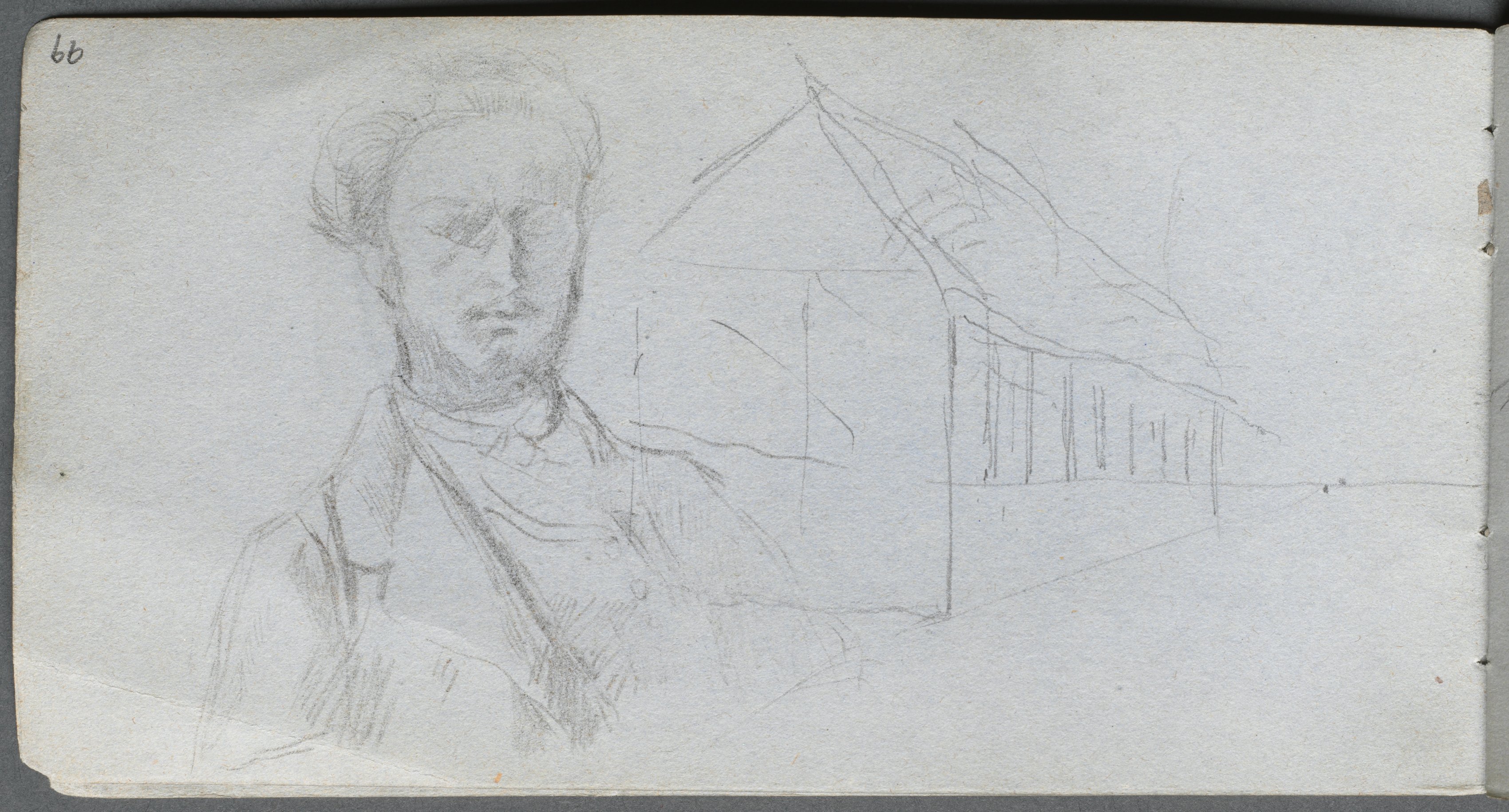 Pencil sketch on paper, a man's upper body and head on the left, wearing a hat, jacket, and scarf, turned slightly to the right, with a building on the right, having a sloping roof and vertical lines suggesting a fence or wall, the paper is aged with a small number "66" in the top left corner.