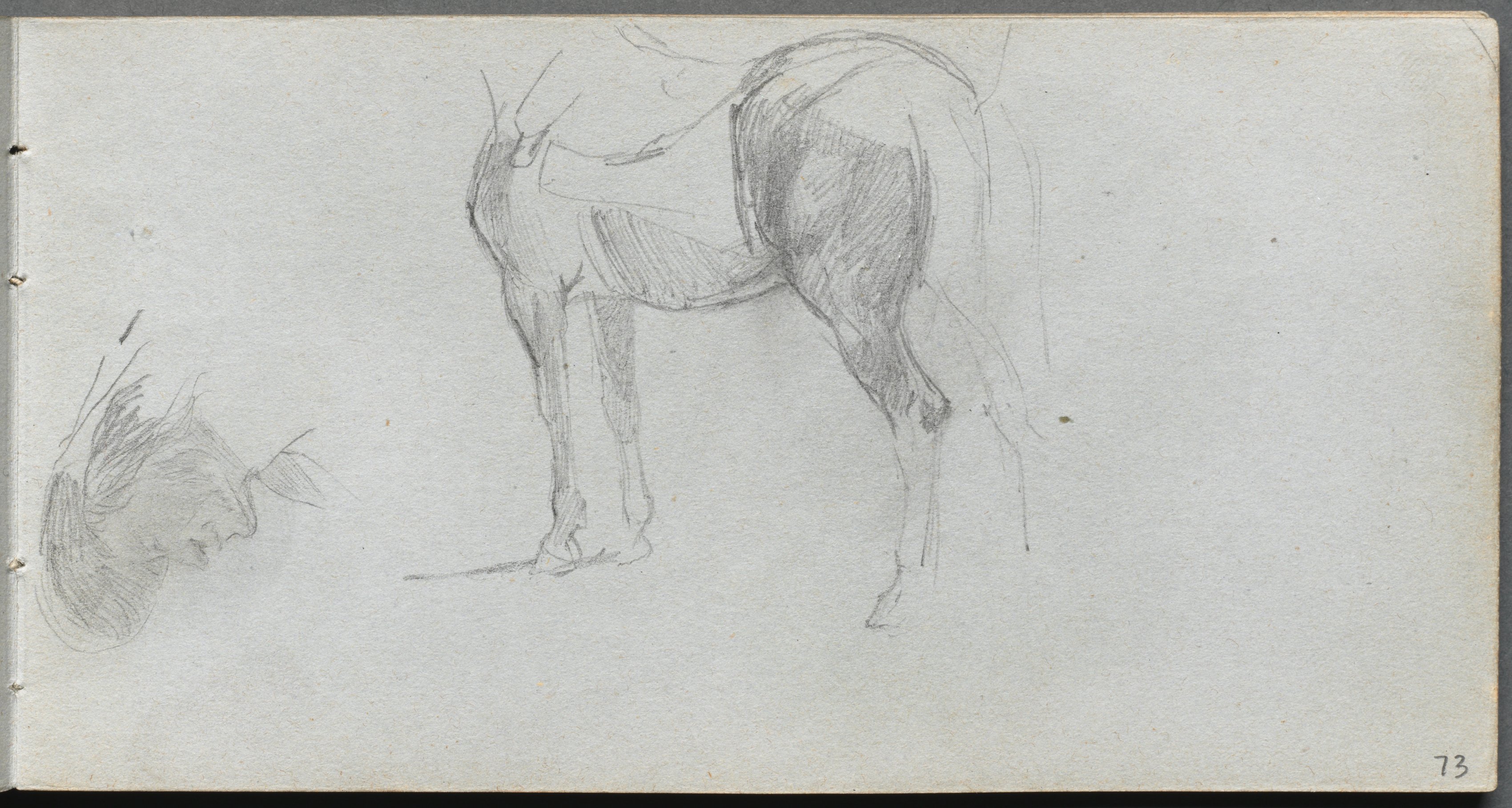 Pencil sketch on paper of a horse in profile. The horse faces left, shown from the neck down. The body and right rear leg are shaded. The left rear leg is unshaded and outlined. A small sketch of a horse's head in profile to the left. Three holes punured down the left side. '73' in bottom right corner.