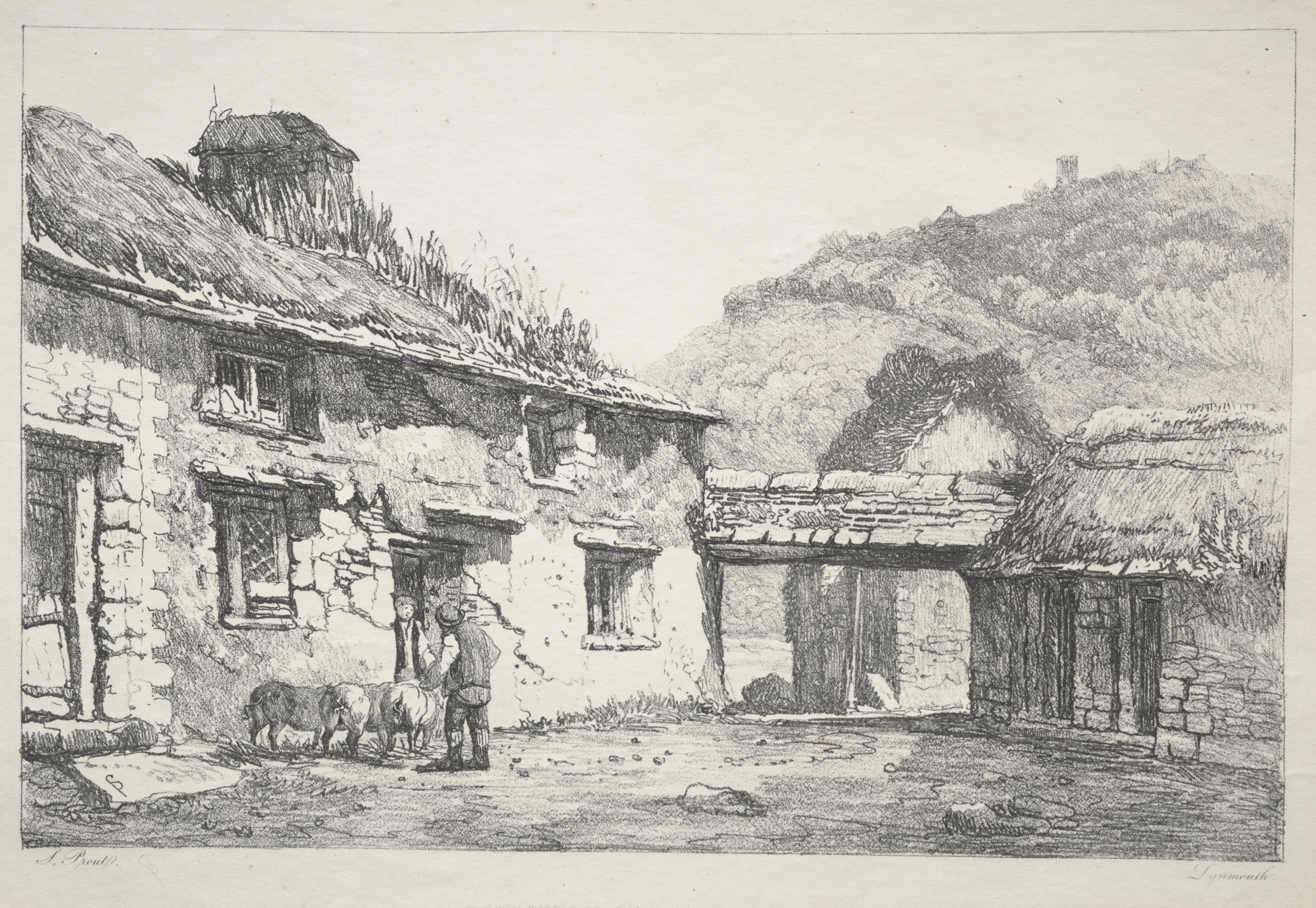 Black and white drawing of a stone house with two people and two animals standing outside. The house has a steeply pitched roof with vegetation growing on top. There are several windows and doorways visible. A covered walkway connects the house to another stone structure on the right. A hill with trees and a building on top is in the background. The image is titled "Lynmouth" and the artist's name is signed in the bottom corners.