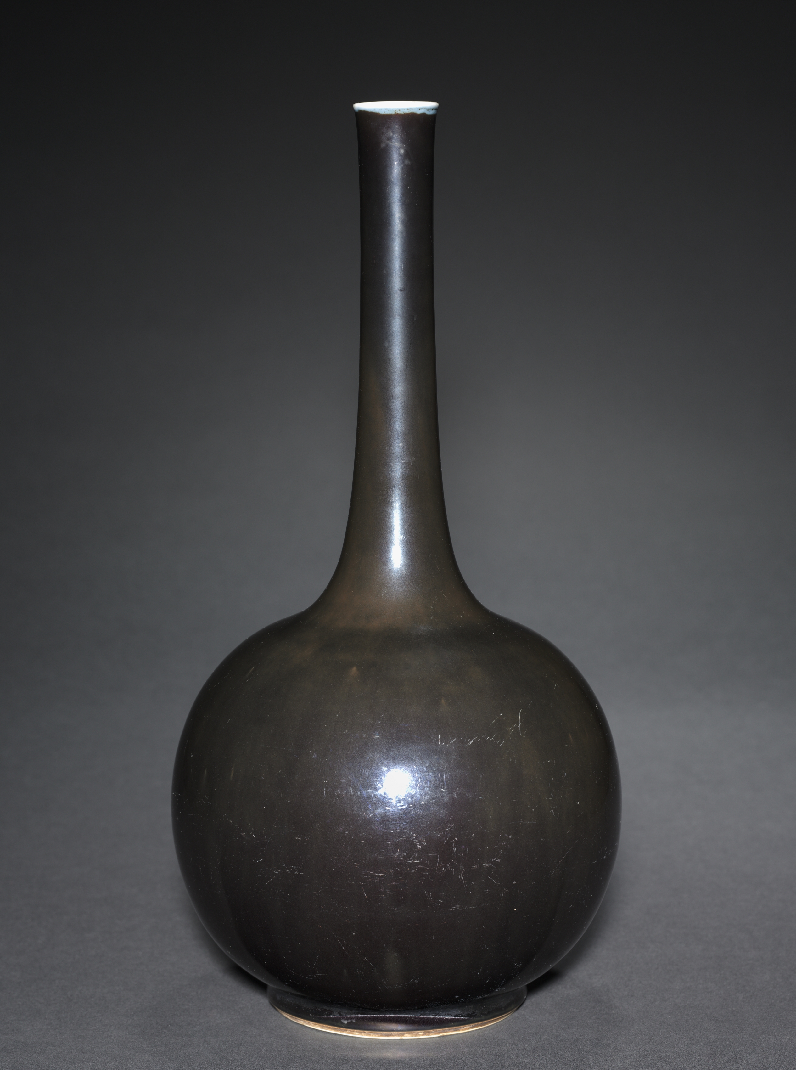 The Globular Vase by Peter Voulkos is a dark-colored, bulbous vase with a long neck. The vase has a rounded body that is wider at the bottom than at the top. The base of the vase is flat and appears to be slightly wider than the body. The neck of the vase is long and narrow, tapering to a small opening at the top. The vase appears to be made of ceramic or glass and has a glossy finish. The color of the vase is primarily dark brown or black with some lighter reflections visible on its surface. The background of the image is a gradient of dark gray to light gray.