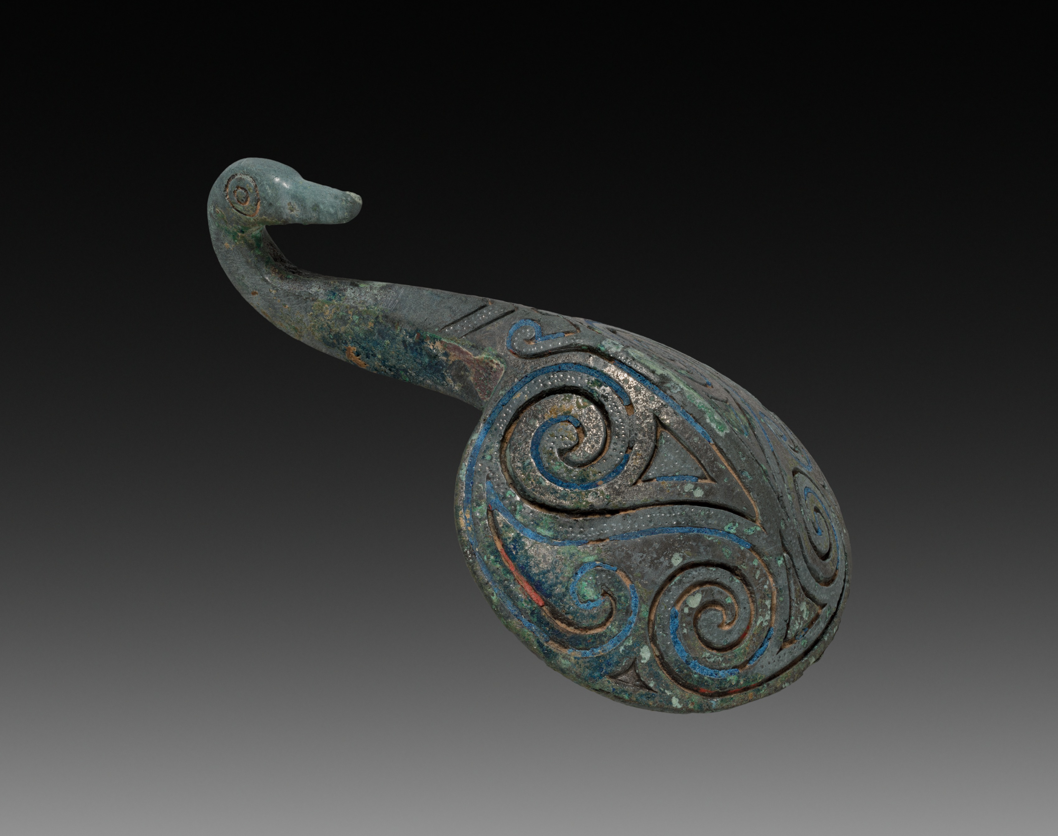 The sculpture titled "Belt Hook" by an unknown artist depicts a weathered, green and gray metal object with a patina. The object has a swan-like head at one end and a large, teardrop shaped body with a rounded end. The swan-like head curves down and attaches to the body, with the beak pointing to the right. The body is adorned with swirling blue and brown designs. The object has a dark green patina with areas of lighter green and brown oxidation. The background is a gradient from black at the top to gray at the bottom.