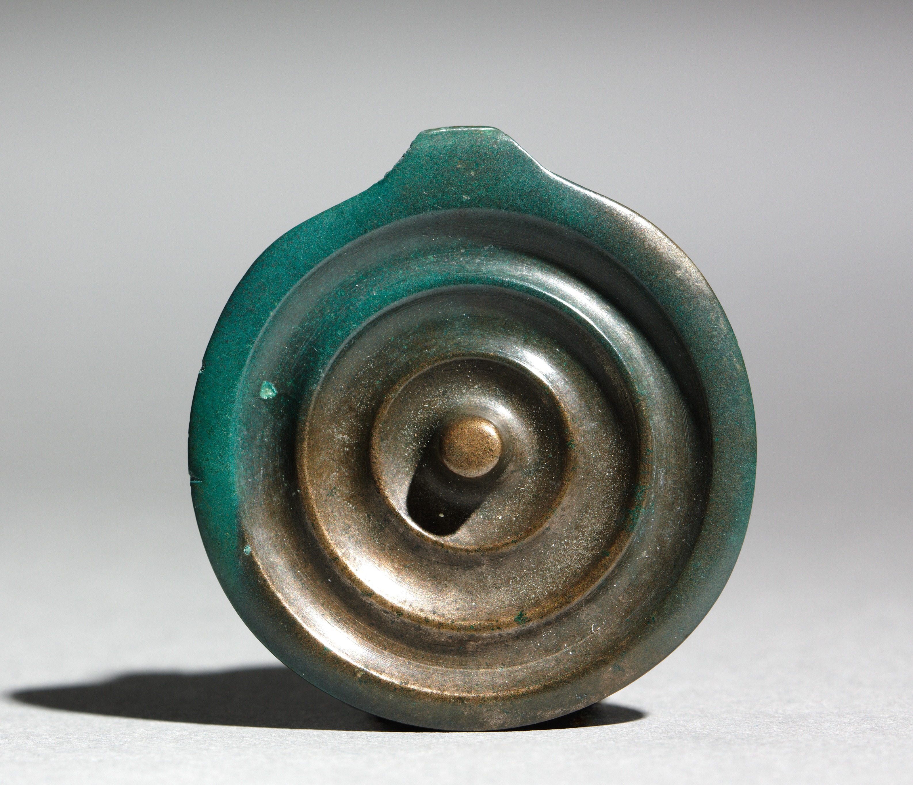 The image depicts a close-up view of a circular object titled "Elements from a Necklace" by an unknown artist. The object displays a spiral design with a small hole at its center. The spiral pattern starts from the center and expands outward in concentric circles. The object has a green outer edge. The background of the image is gray. The object casts a shadow to the left. The object appears to be made of metal. The metal appears to be weathered and aged.