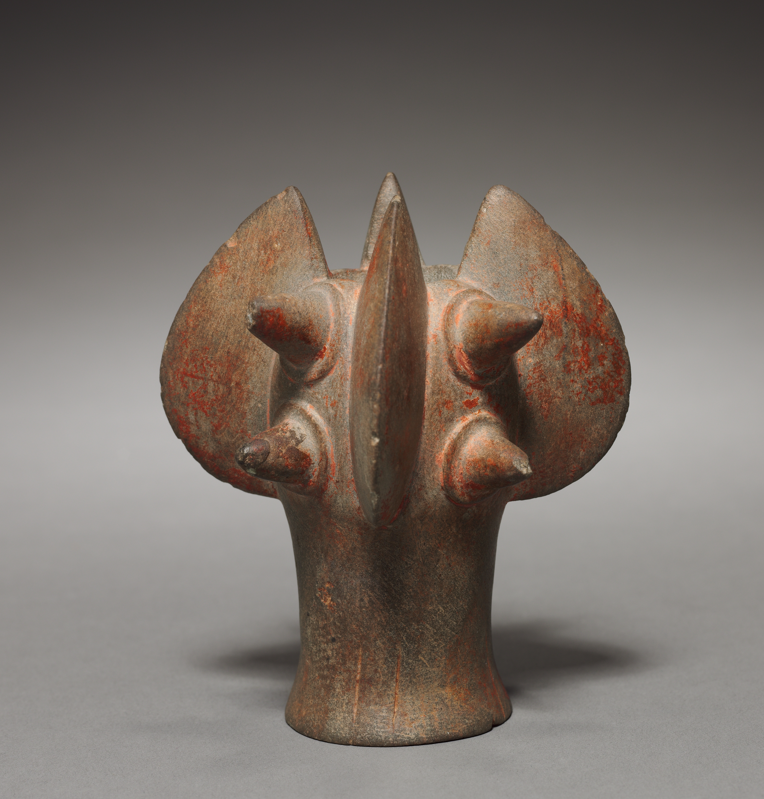 The sculpture "Mace Head" by an unknown artist depicts a rusted, brown metal object with a wide base that tapers upward. The object features a central, elongated point flanked by two curved sections resembling horns or wings, each adorned with smaller points. The surface exhibits a weathered appearance with visible rust and red discoloration. The background is a gradient gray, transitioning from dark at the top to light at the bottom, with the object casting a shadow on the surface below.