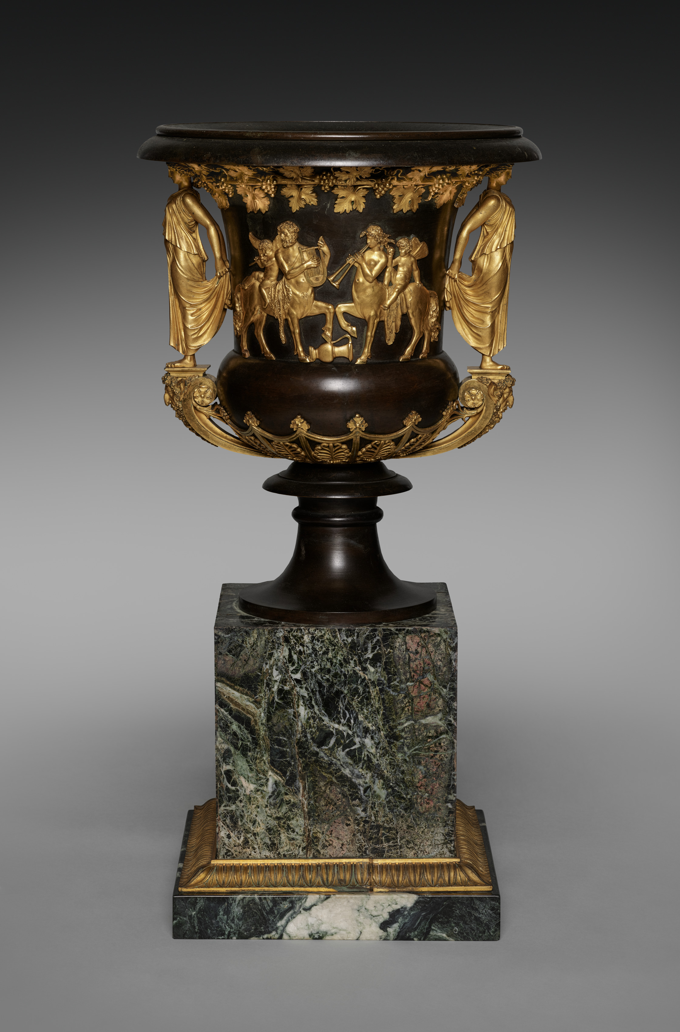 The vase is on a green marble pedestal with a gold trim. The vase itself is dark brown with a wide mouth and a narrow base. There are gold figures and designs on the vase. Two gold female figures are on either side of the vase near the top. The gold figures are wearing classical clothing. There are also gold grapevine leaves and clusters of grapes around the top of the vase. In the center of the vase, there are three gold figures with a dog. The background of the image is a gradient from dark gray at the top to light gray at the bottom.