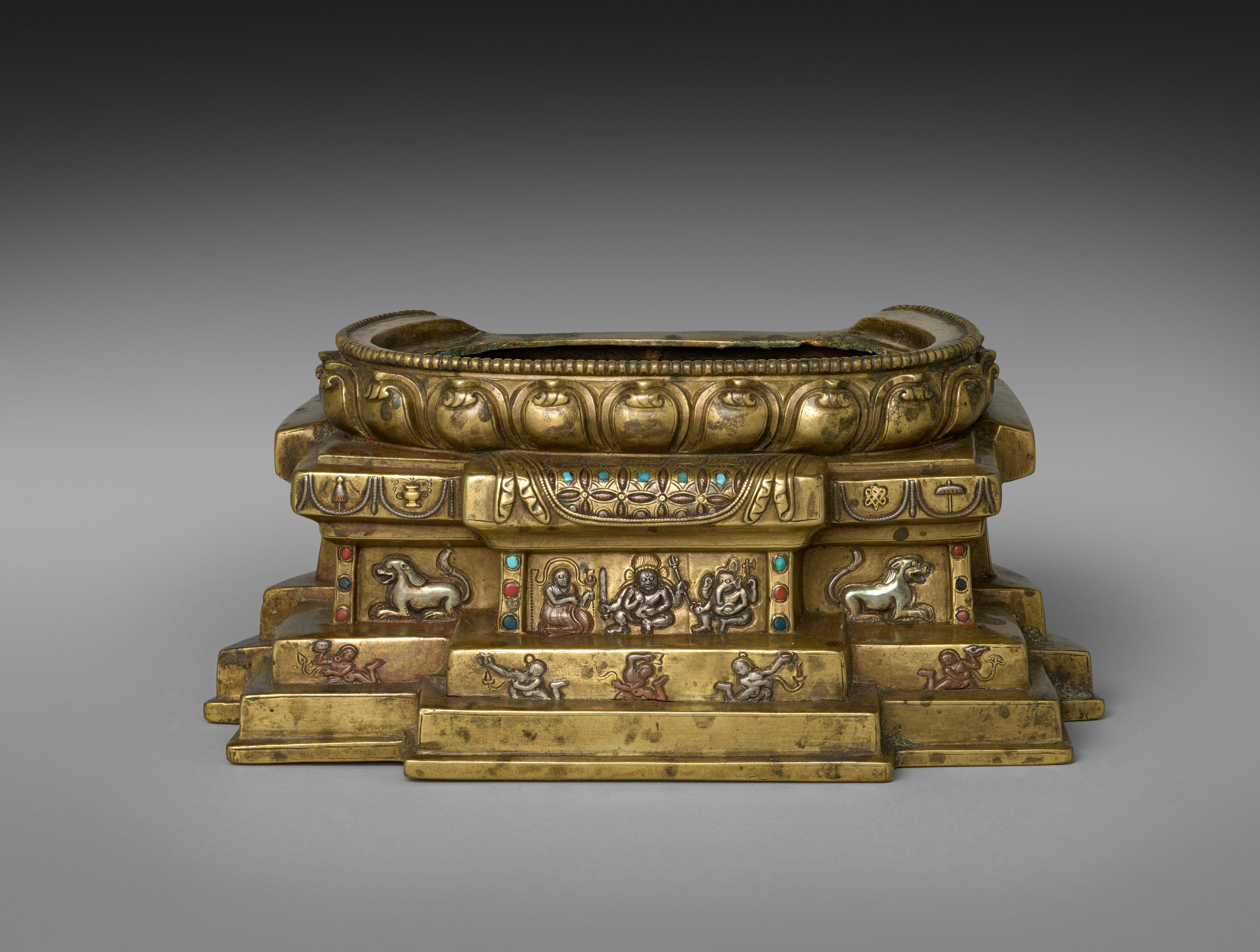 Brass-colored metal object with a stepped rectangular base. The base features a flat bottom step with small relief figures on the sides. Above this, a larger rectangular section contains relief figures of humans and animals on the sides and three figures on the front. The top section consists of a row of ovular shapes. The object has a large circular depression on top with a decorative border featuring a leaf design and a beaded edge. Two curved handles are on either side of the top. The object has a weathered appearance. The background is gray and dark at the top.