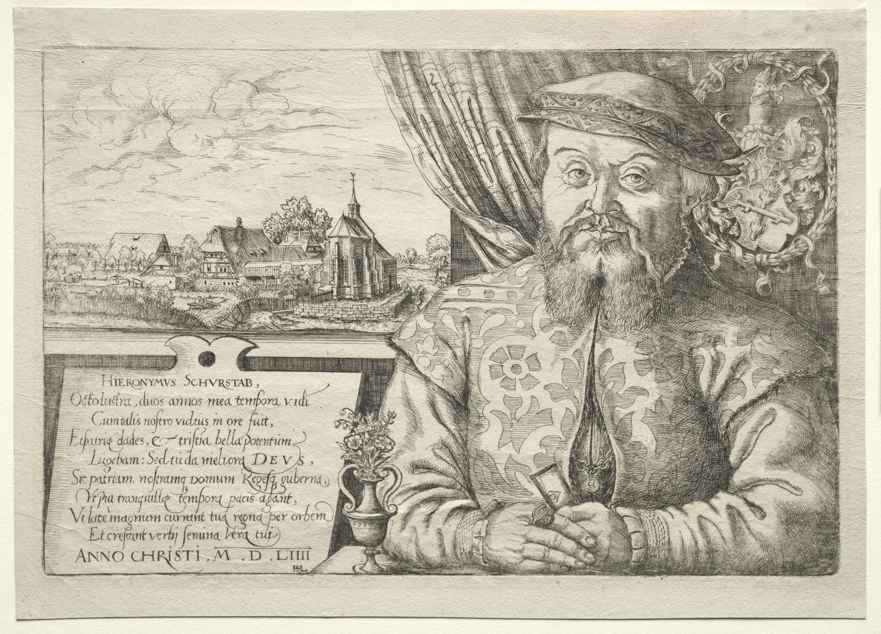 Beige-colored paper with a portrait of an older man with a light-colored beard and mustache. The man is wearing a patterned shirt with a high collar and a hat. The man is sitting in a chair with a curtain behind him. The man is looking to his right with hands clasped. To the left of the man is a table with a flower vase. On the table is a paper with writing. In the background to the left is a landscape with buildings and trees under a cloudy sky. A coat of arms is visible to the right of the man.