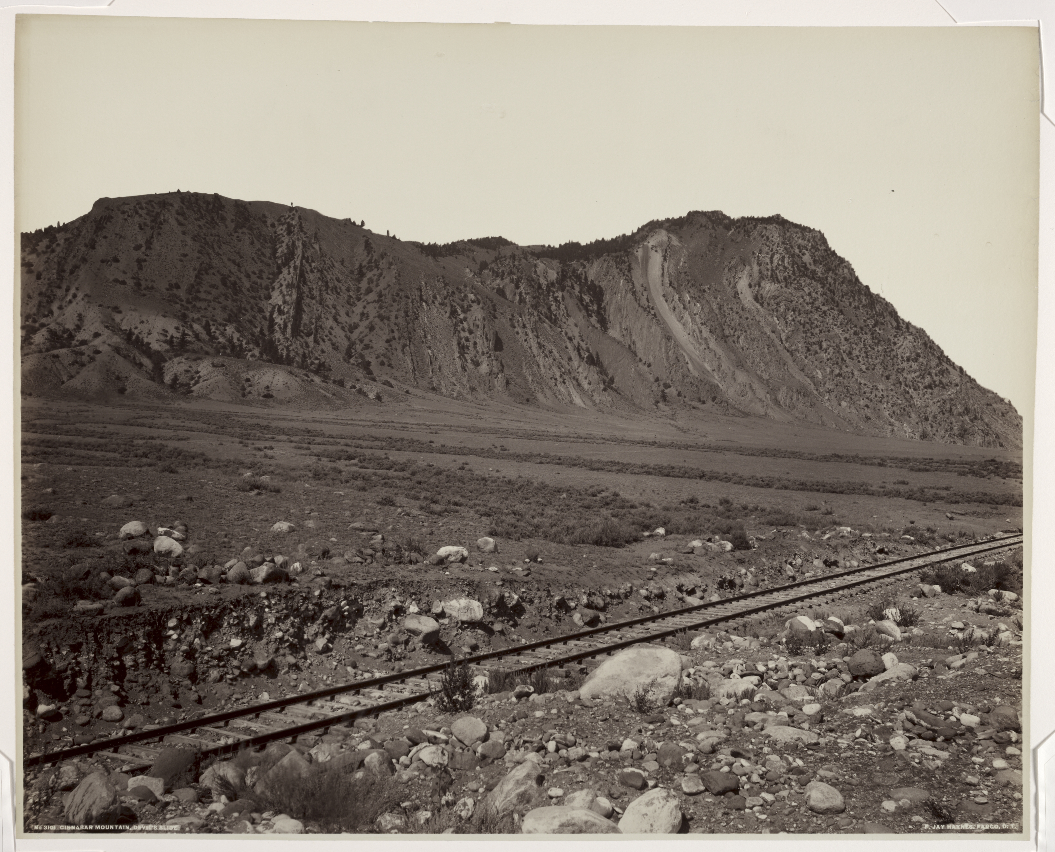 Black and white photograph of a mountain. A train track runs from the bottom-left to the bottom-right. The track is on a slight decline and the ground slopes downward from the track to the background. In the background, a long, dark mountain. The sky is light-colored. The entire photograph is surrounded by a light border.