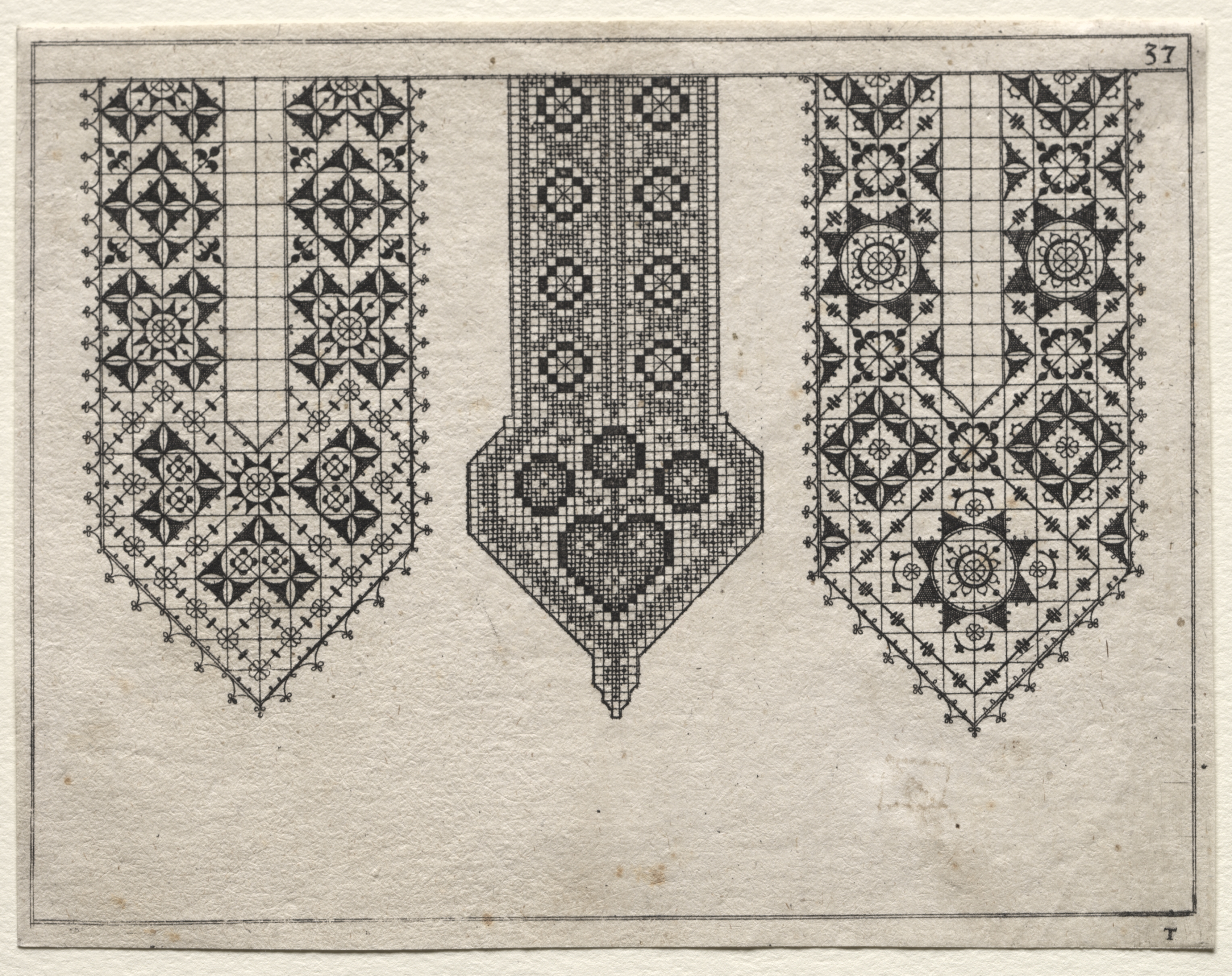 Black and white illustration on aged paper. Three designs side by side. Each design has a wide top that narrows to a point at the bottom. The outside designs are symmetrical and have a grid with a repeating pattern of diamonds and circles. The design in the middle has a grid with a repeating pattern of circles. The designs are bordered by a thin line and there is a thin line around the edge of the paper. A small number is in the top right corner.