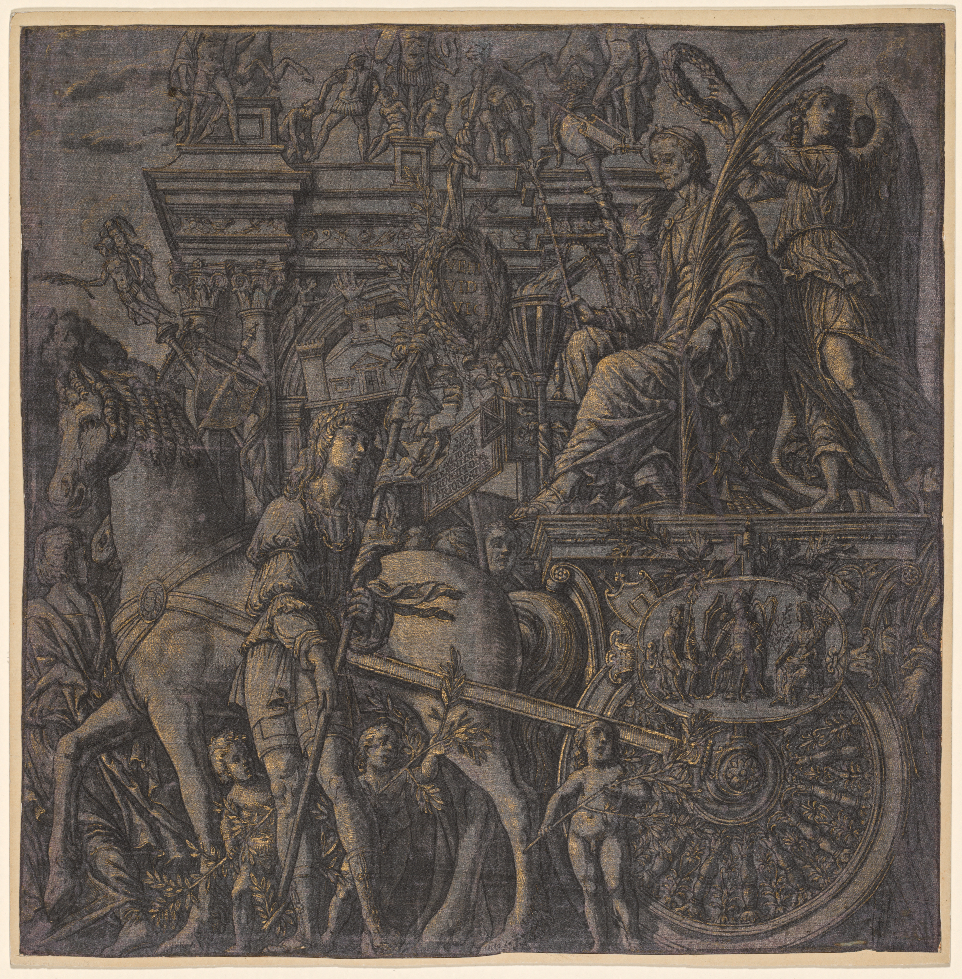 Black and gold drawing of a man sitting on a decorative chariot pulled by four horses; man holds a scepter; angel beside him; many figures on chariot; sky in background with figures; beige border. The Triumph of Julius Caesar: Caesar Triumphant by Andrea Andreani.