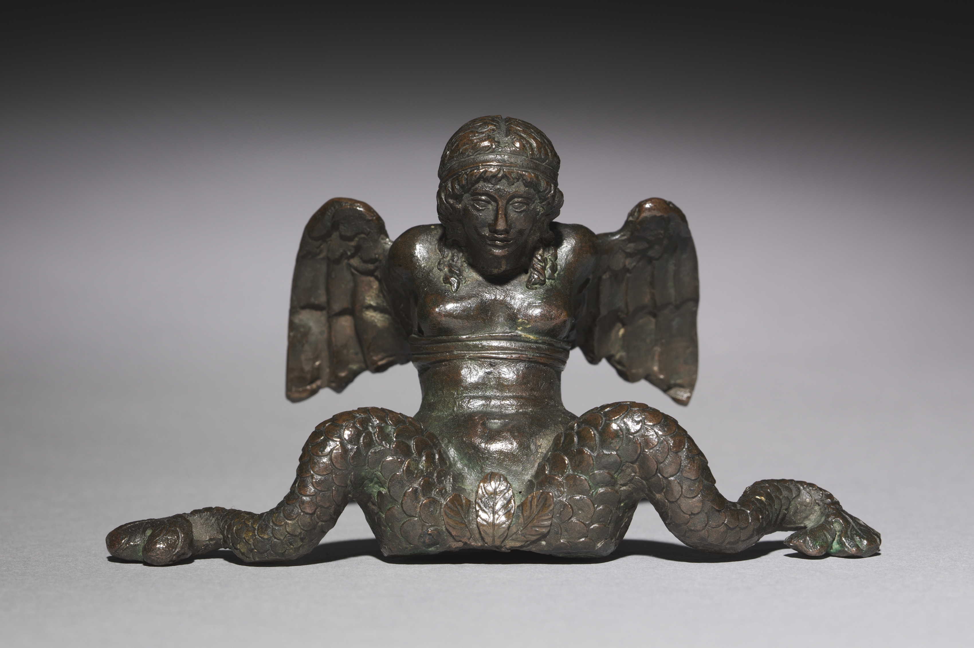 The bronze sculpture depicts a winged creature with the upper body of a woman and lower body of a snake. The creature has a humanoid head with short hair wearing a headband, and large wings protruding from its back. Its torso is bare and has a defined waist. The lower body is covered in scales and has two legs ending in pointed tips, resembling a snake's tail. The sculpture sits on a surface with a gray background that darkens towards the top. The creator of this piece is Leone Leoni and the title is "Doorpull".
