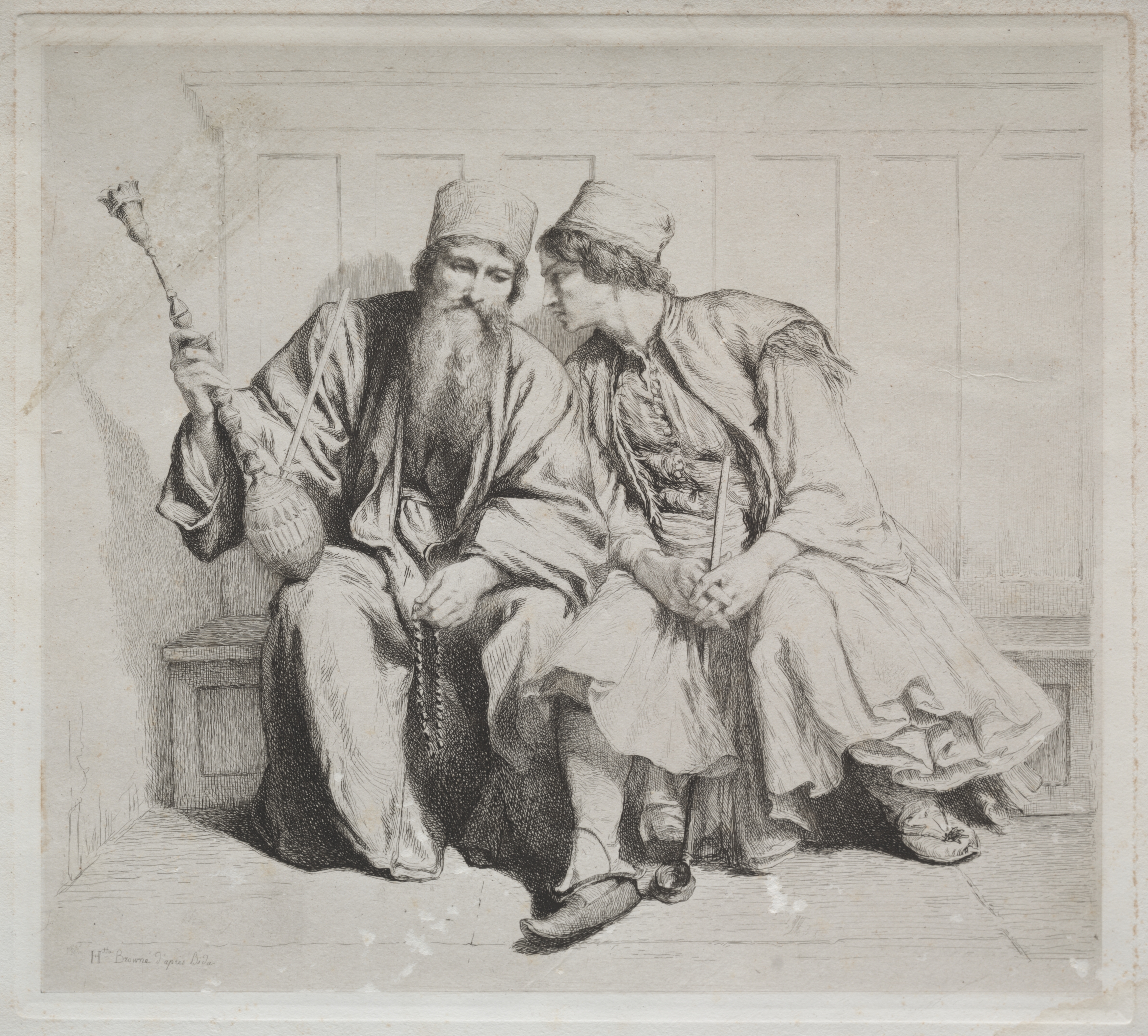 Black and white drawing of two men sitting on a bench. The man on the left is older, with a long beard, wearing a robe and a small hat. He holds a staff in his right hand and a rosary in his left hand. The man on the right is younger, wearing a robe and a small hat, with his hands clasped together in his lap. The background is a wall with rectangular panels. The drawing is titled "Young Greek Man in Conversation with a Priest" and was created by Henriette Brown.