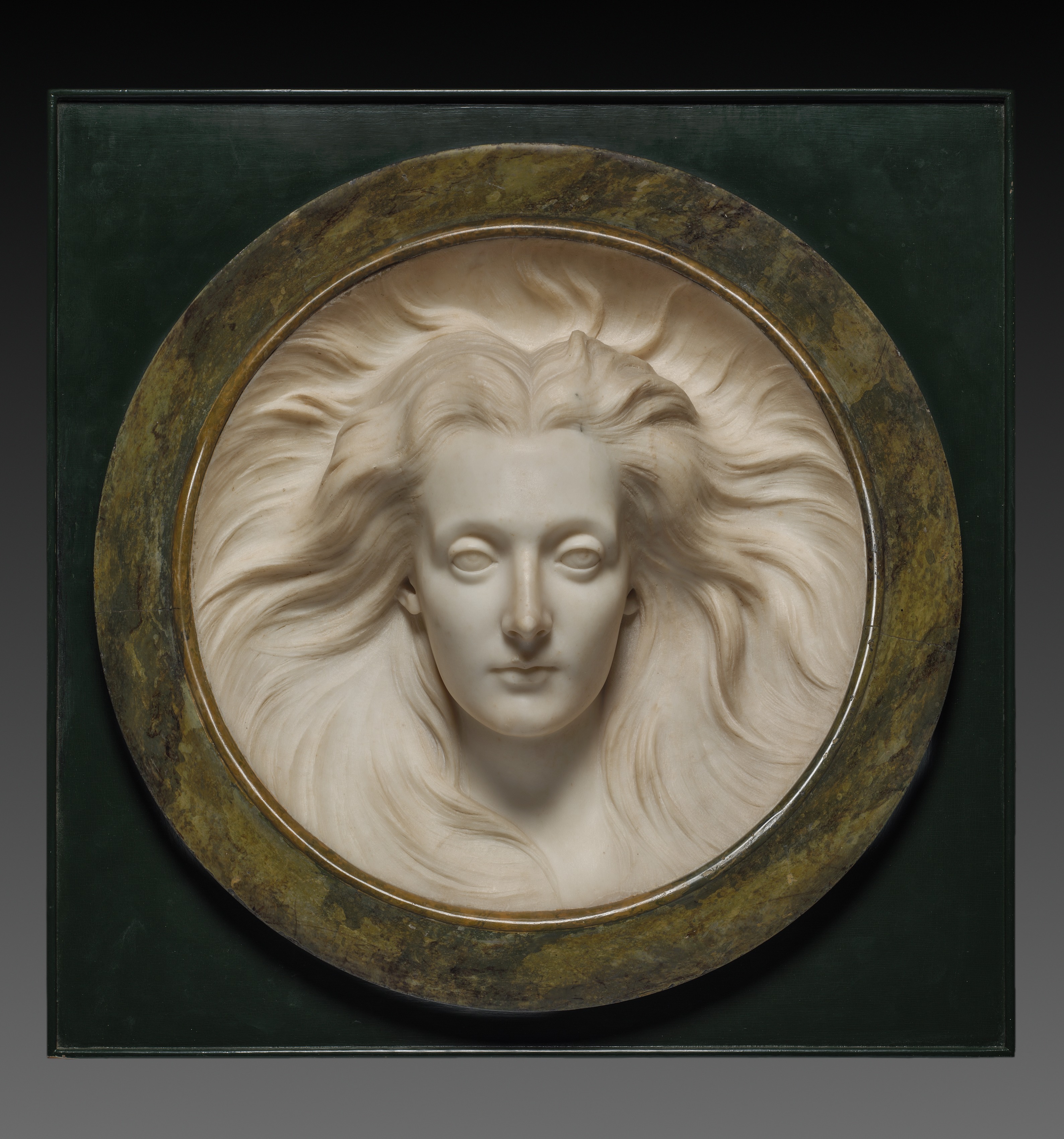 A sculpture depicting a woman's head with long flowing hair is set within a circular frame. The frame appears to be made of bronze or brass with a green and brown patina. The woman's facial features are smooth with her eyes closed and lips slightly parted. Her hair flows outward in wavy lines. The circular sculpture is mounted on a square green background.