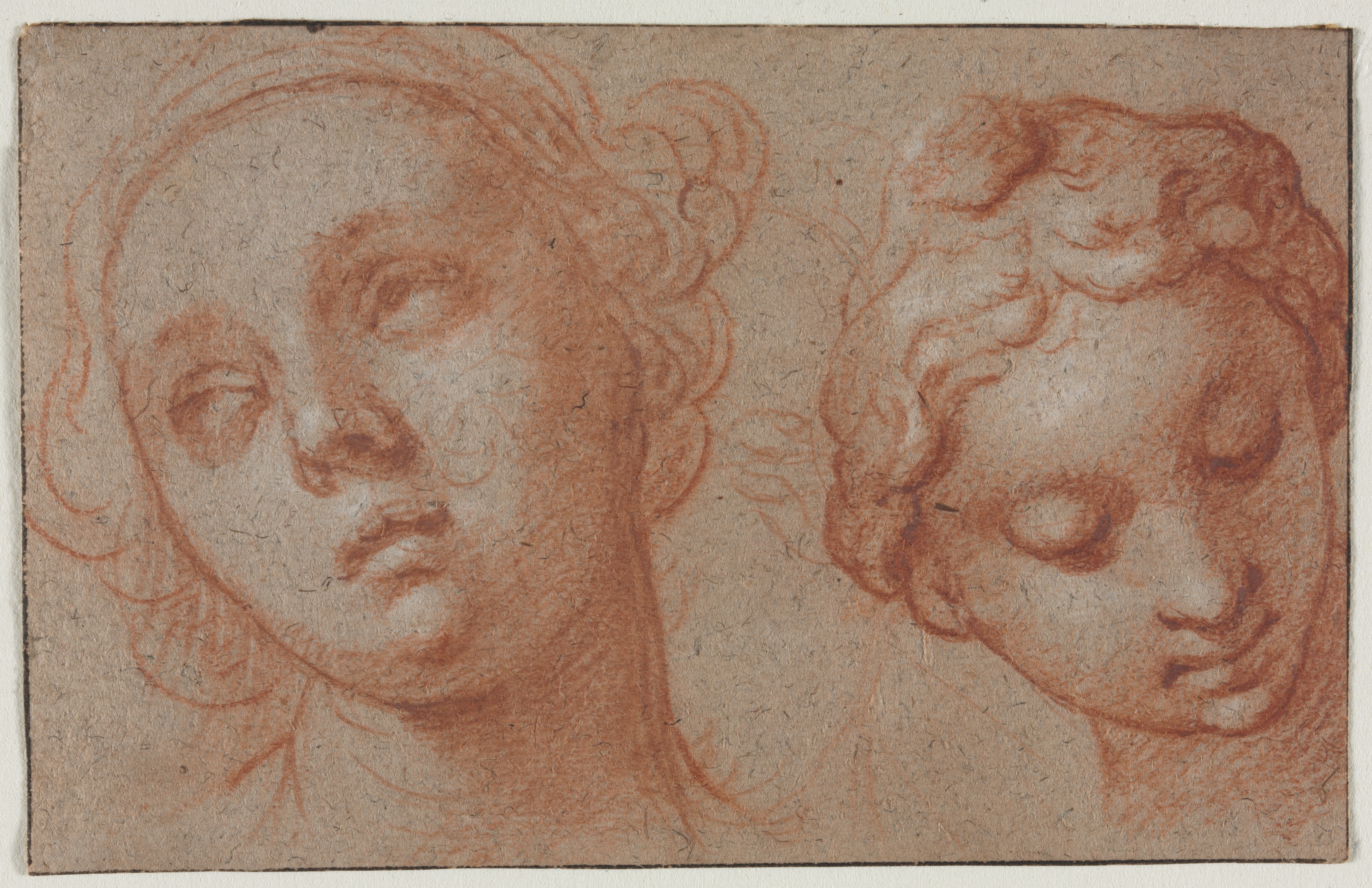 The drawing depicts two female heads drawn in reddish-brown on a light-brown background. The head on the left faces slightly right; the woman has hair pulled back from her face. The head on the right faces down and to the right; the woman has curly hair. The drawing by Abraham Bloemaert is titled "Two Female Heads".